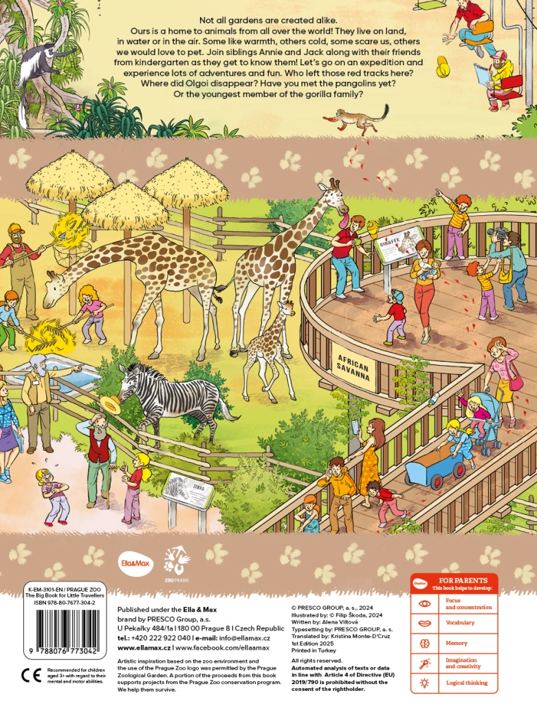 Su šia nuostabia knyga aplankysite vieną gražiausių pasaulio zoologijos sodų – Prahos zoologijos sodą. Čia ne tik susitiksite su įvairiomis gyvūnų rūšimis, bet ir atrasite įtraukiančias istorijas, kurios nuves jus į paslaptingą gyvūnų pasaulį. Prisijunkite prie nuotykių kupinos kelionės ir sekite raudonus pėdsakus, kurie nuves jus pas įspūdingus skujuočius arba jauniausią gorilų šeimos narę.