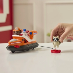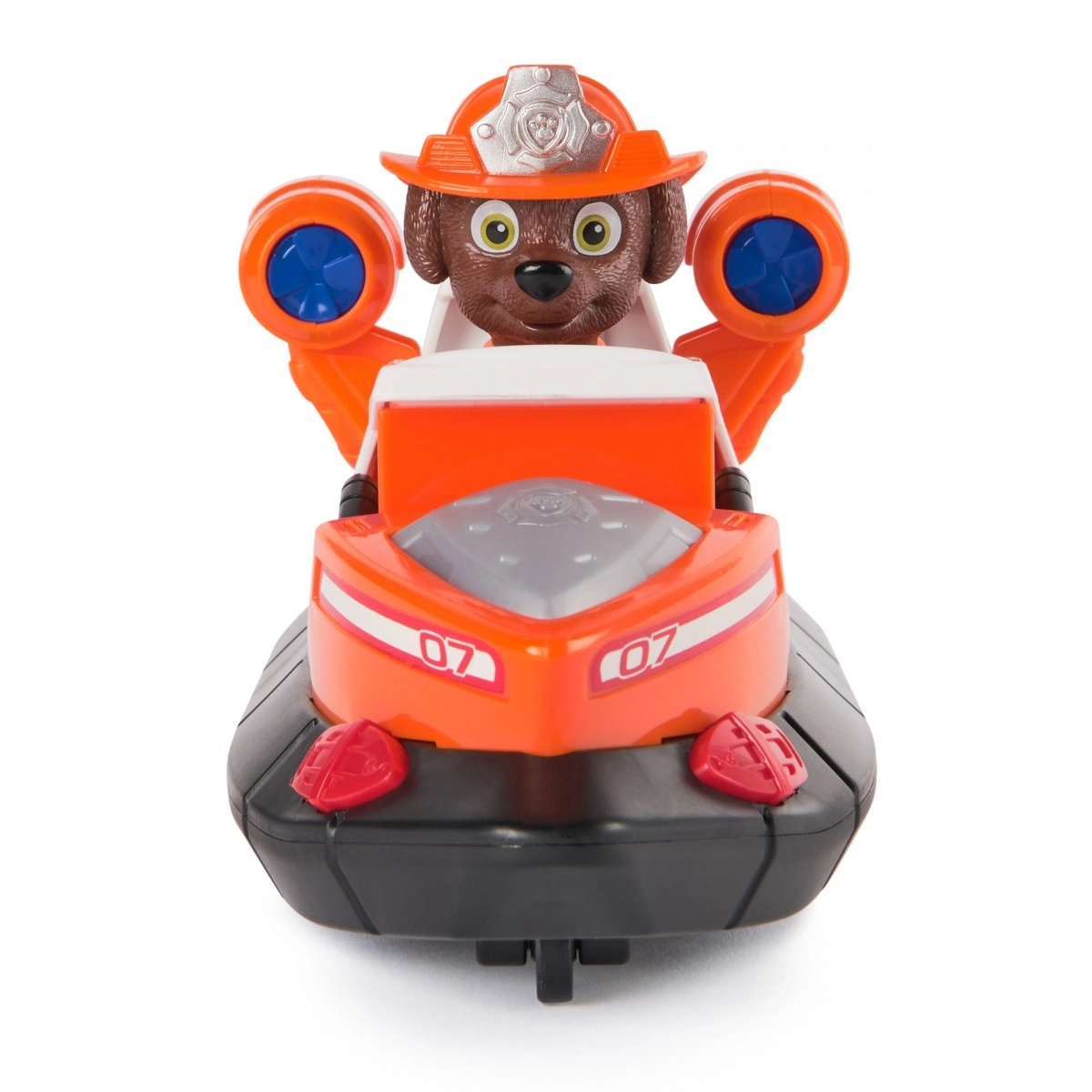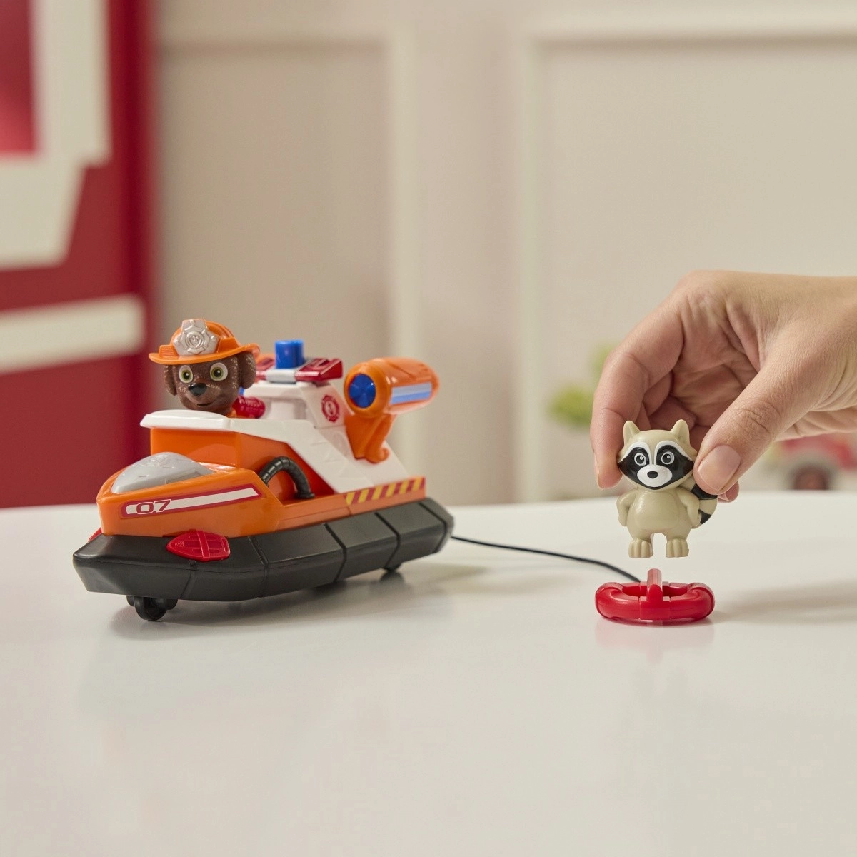 Zuma, daugiau kaip 5 cm ūgio su savo ugniagesio kostiumu, pasirengęs išgelbėti situaciją. Gaisrinė valtis yra aprūpinta gelbėjimo ratu, pritvirtintu prie virvelės, kad netrūktų įtemptų nuotykių. Zumai žavesio suteikia ir mažas meškėnas, kurį galima išgelbėti. Vaikai gali paspausti mygtuką, kad iššautų gelbėjimo ratą, į kurį meškėnas puikiai telpa. Dėl autentiško Paw Patrol stiliaus šis žaislas atrodo lygiai kaip seriale, įkvepiantis vaikus nuotykiams.