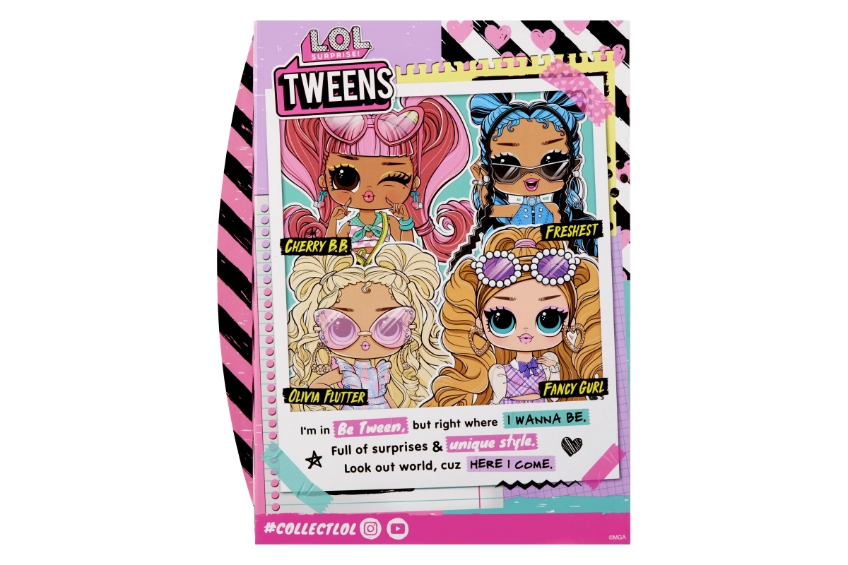 Stilinga lėlė L.O.L. Surprise! Tweens Fancy Gurl pristatoma nauju įvaizdžiu, su vešliais plaukais, sąnarinio kūno konstrukcija ir 10 staigmenų. Atrask madingą aprangą, žavius priedus, stilingus batus ir eksponuok ją ant stovelio tobuloms pozoms. Idealu kolekcininkams ir vaikams, kurie mėgsta kūrybišką žaidimą ir persirengimą.