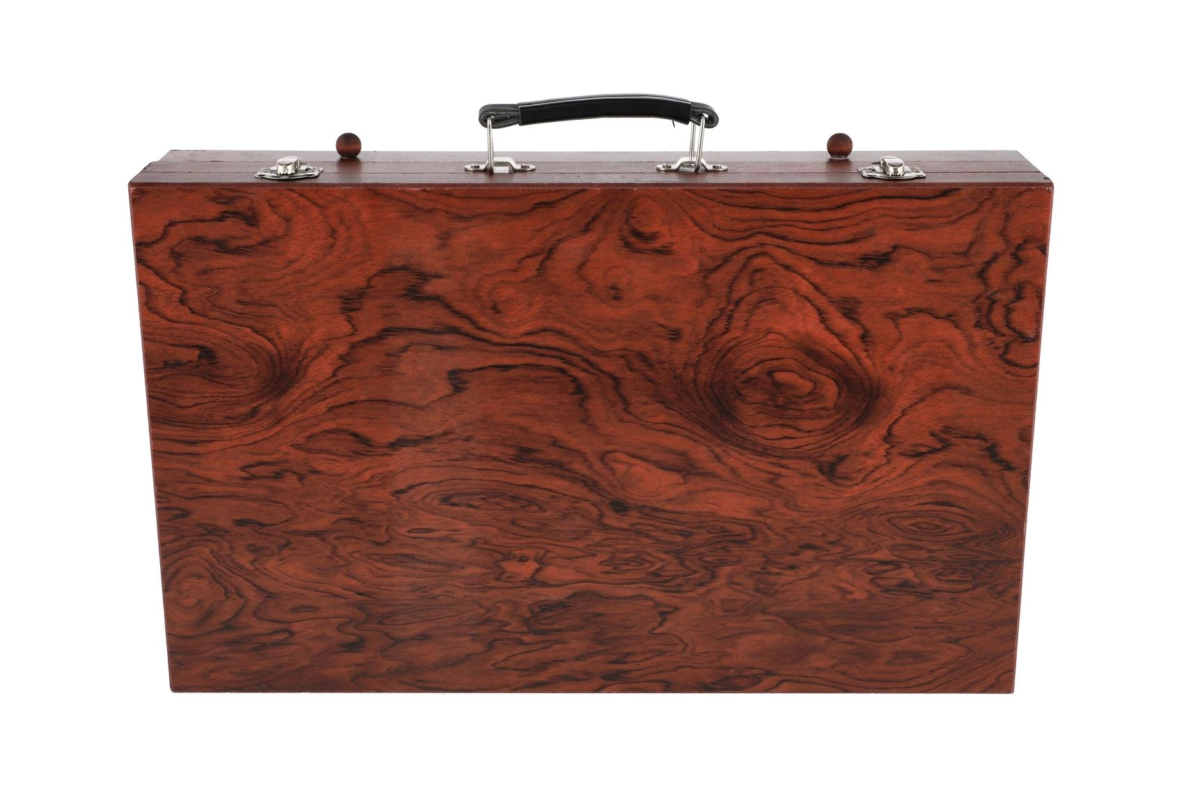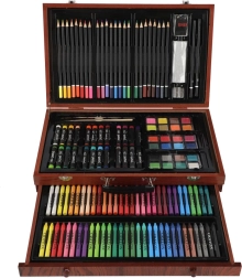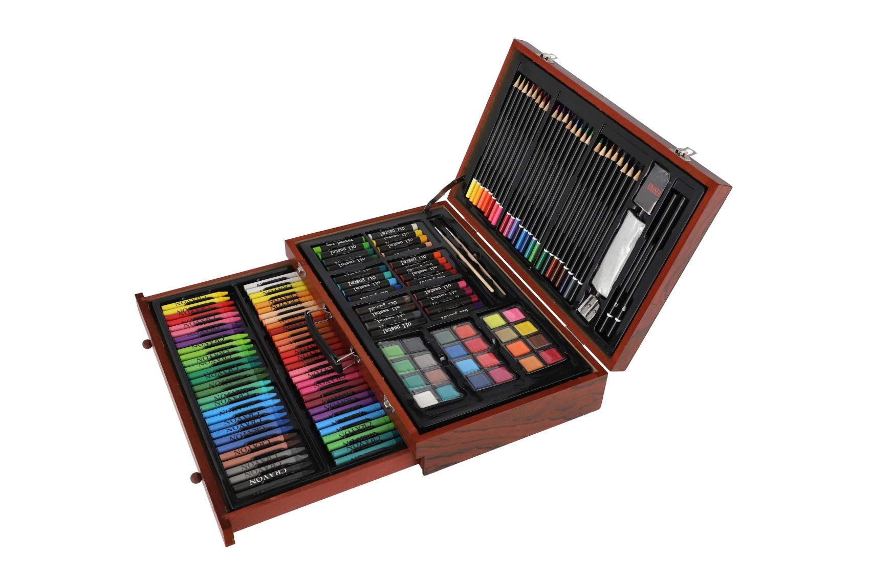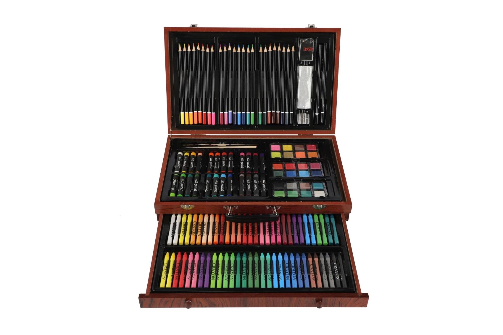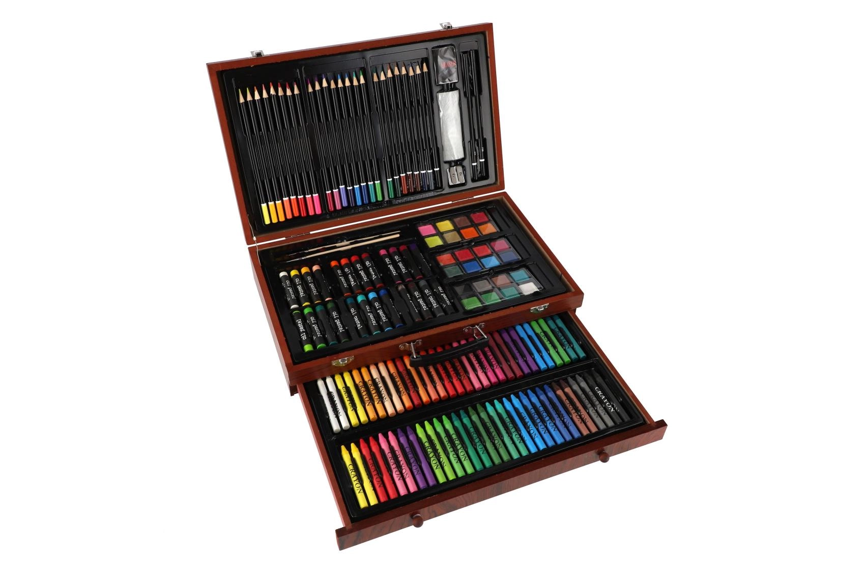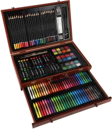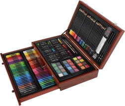 Universali kūrybinė priemonė mažiems ir vyresniems menininkams – iš viso 143 dalys piešimui, tapybai ir kūrimui. Viskas tvarkingai sudėta į elegantišką medinį lagaminėlį su užsegimu, kurio matmenys 38 × 25 × 8 cm. Idealu kūrti namuose, mokykliniams projektams ir kelionėms. Tinka vaikams nuo 14 metų.