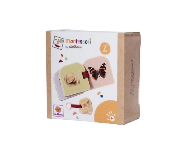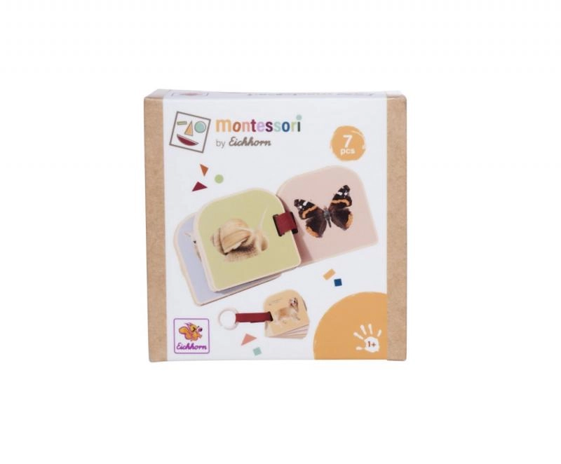 Ši Montessori medinė knygelė skatina natūralų smalsumą ir pojūčių raidą. Ant 6 tvirtų medinių puslapių iš abiejų pusių spausdintos gyvūnėlių iliustracijos, kurios sudomina spalvomis ir paprastumu. Dėl užapvalintų kampų ir malonaus medžio paviršiaus knygelę patogu laikyti net mažose rankytėse.