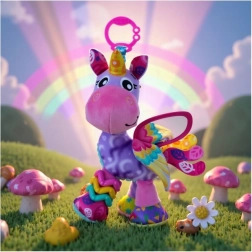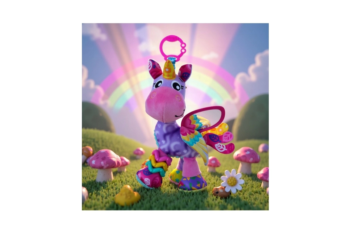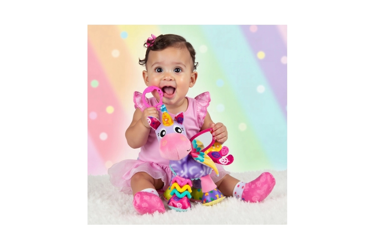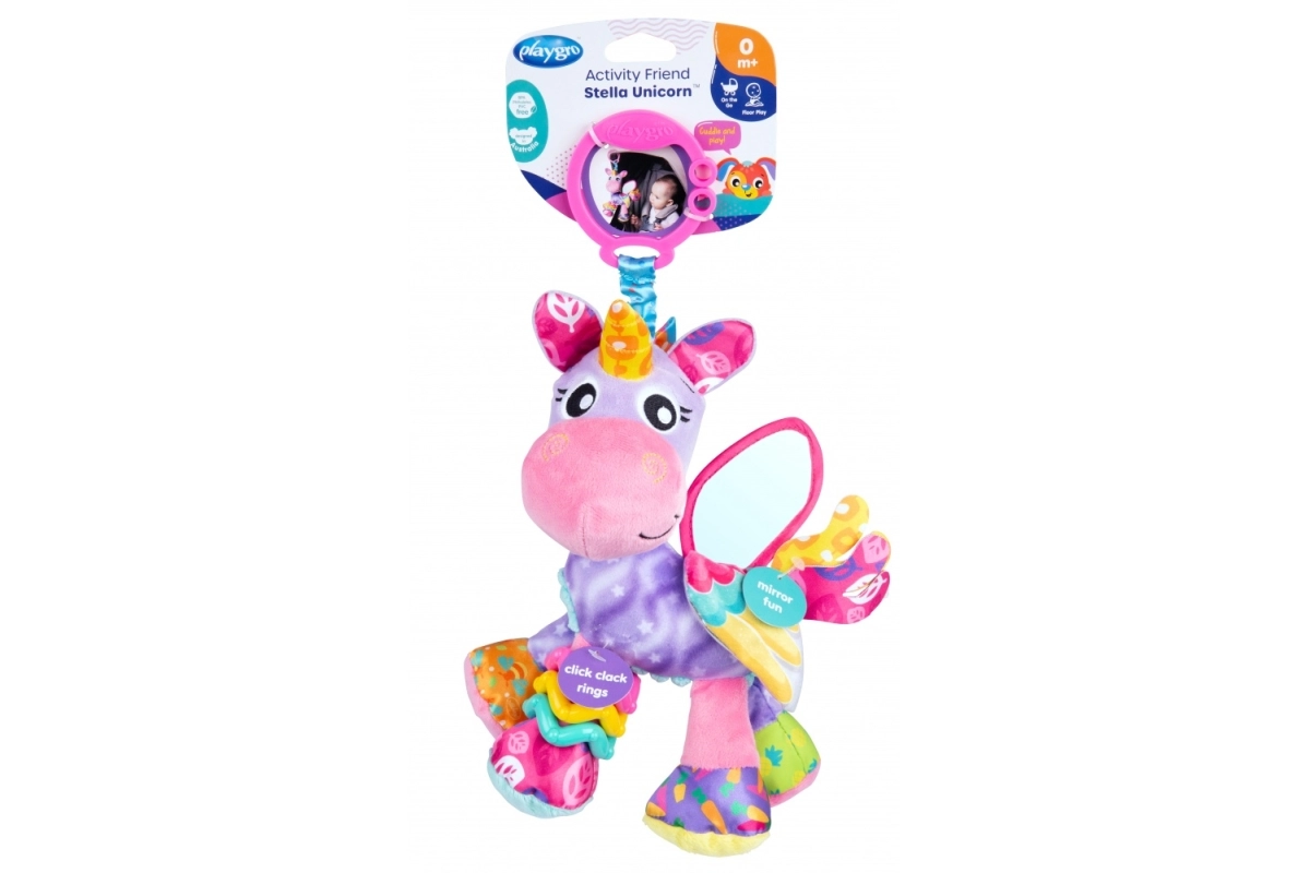 Žavus Playgro vienaragis Stella – minkštas pakabinamas žaislas patiems mažiausiems, skatinantis pojūčių raidą ir linksminantis tiek kelionėje, tiek namuose. Jis siūlo veidrodėlį savęs pažinimui, šnarantius ir skambančius elementus, įvairias tekstūras ir kontrastinius raštus, stimuliuojančius regą, lytėjimą ir klausą. Dėl praktinio C segtuko jį lengvai pritvirtinsite prie vežimėlio, automobilinės kėdutės ar lovytės.
