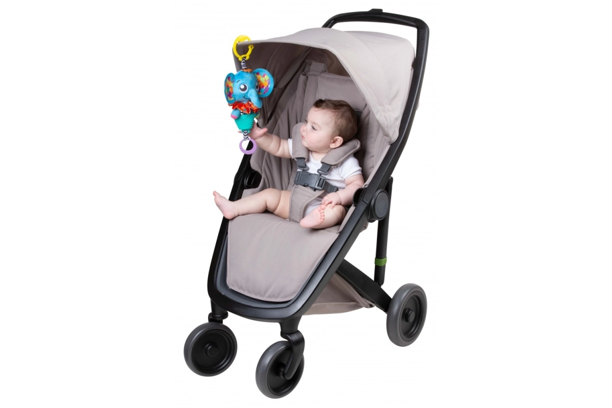 Mielas muzikinis drambliukas Elly iš Playgro – minkštas kabinamas žaislas, kuris raminą melodijomis, praskaidrina keliones ir kartu skatina jutiminę raidą. Dėl patraukiamo mechanizmo kūdikis gali pats įjungti muziką, kontrastingos spalvos ir įvairios tekstūros stimuliuoja regą bei lytėjimą, o „C“ segtukas leidžia lengvai pritvirtinti prie vežimėlio, autokėdutės ar lovytės.
