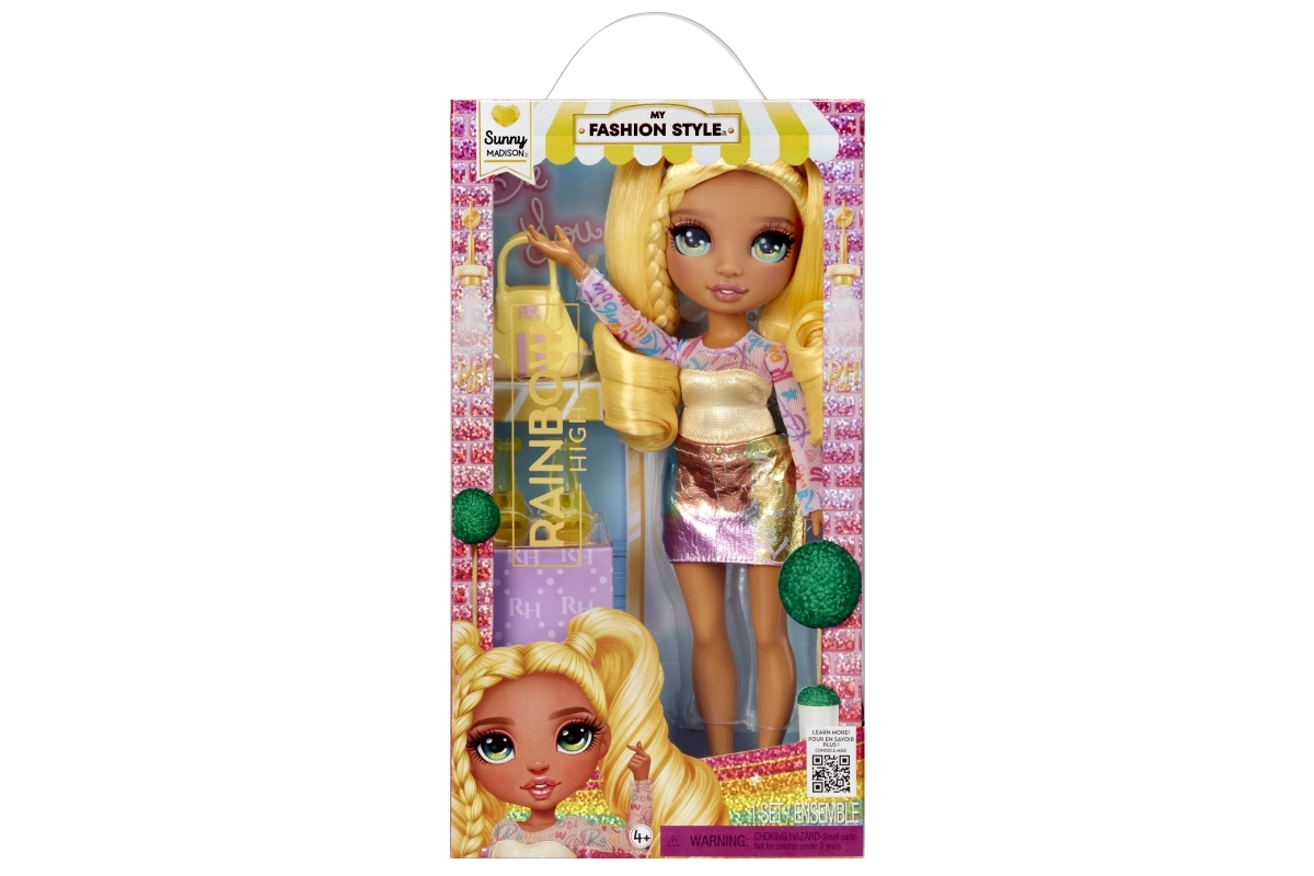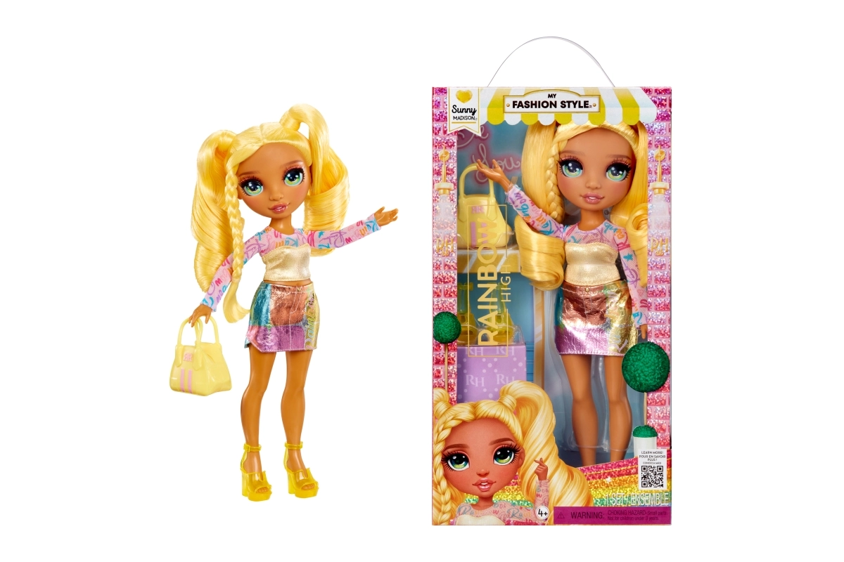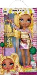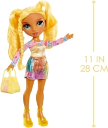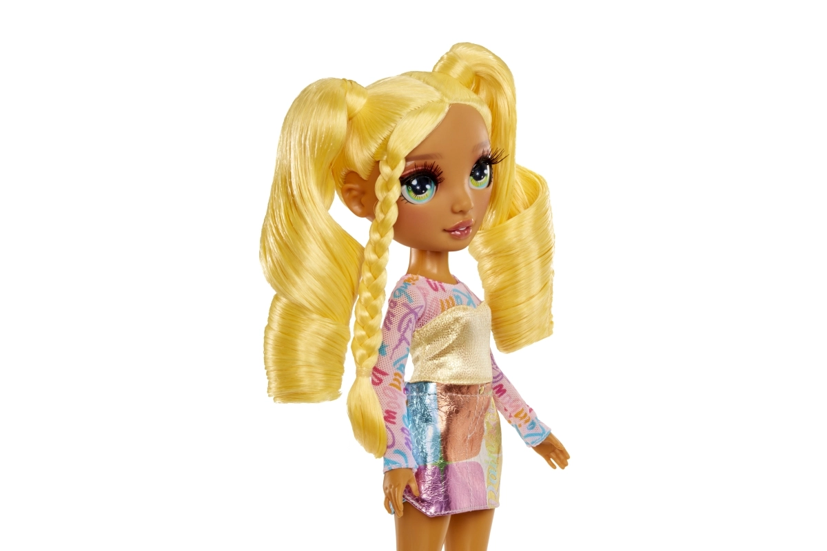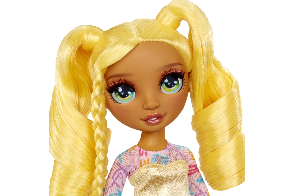 Sunny iš RAINBOW HIGH – pasitikinti savimi mados mūza, įkvepianti vaikus išreikšti savo individualumą. Jos aprangoje dera ryškiai geltoni ir vaivorykštės akcentai – išraiškingi marškinėliai, nesenstanti sijonas, elegantiški aukštakulniai ir derančios spalvos rankinė. Plaukai suformuoti į žaismingas kasas, skatinančias kūrybišką šukavimą.