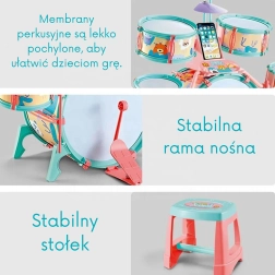 Šis vaikų būgnų rinkinys yra puiki muzikinės kelionės pradžia. Jis suteikia turtingus garso efektus, stabilią konstrukciją ir praktišką telefono ar planšetės laikiklį, kad būtų galima groti su muzikiniu pritarimu. Dėl kompaktiškų matmenų puikiai tinka vaikų kambariui, o prižiūrėti pakanka drėgnos šluostės.
