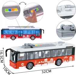 Šis detaliai sukurtas 1:16 mastelio troleibusas suteikia vaikams autentišką miesto transporto patirtį. Dėl keturių mygtukų ant stogo jie mėgausis realistiškais važiavimo, signalų ir pranešimų garsais, o vidinis apšvietimas sustiprina tikro transporto priemonės atmosferą. Frikcinė pavara leidžia po lengvo pastūmimo nuvažiuoti kelis metrus tiesiai.