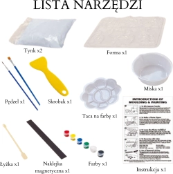 - Visapusiška pakuotė – formos, gipsas, dažai, teptukai ir įrankiai, įskaitant maišymo dubenėlį.
