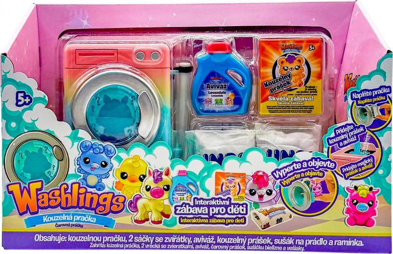 Paversk skalbimą magišku ritualu! Mini skalbyklė Washlings su atidaromomis durelėmis, besisukančiu būgnu ir vandens išleidimo žarnele suteikia vaikams realistišką, bet saugų buities žaidimą. Pakuotėje rasi „nešvarų“ maišelį – po „skalbimo“ jame atsiskleis netikėtas gyvūnėlis ir minkštas rankšluostėlis, kurį gali pakabinti ant mini džiovyklės.