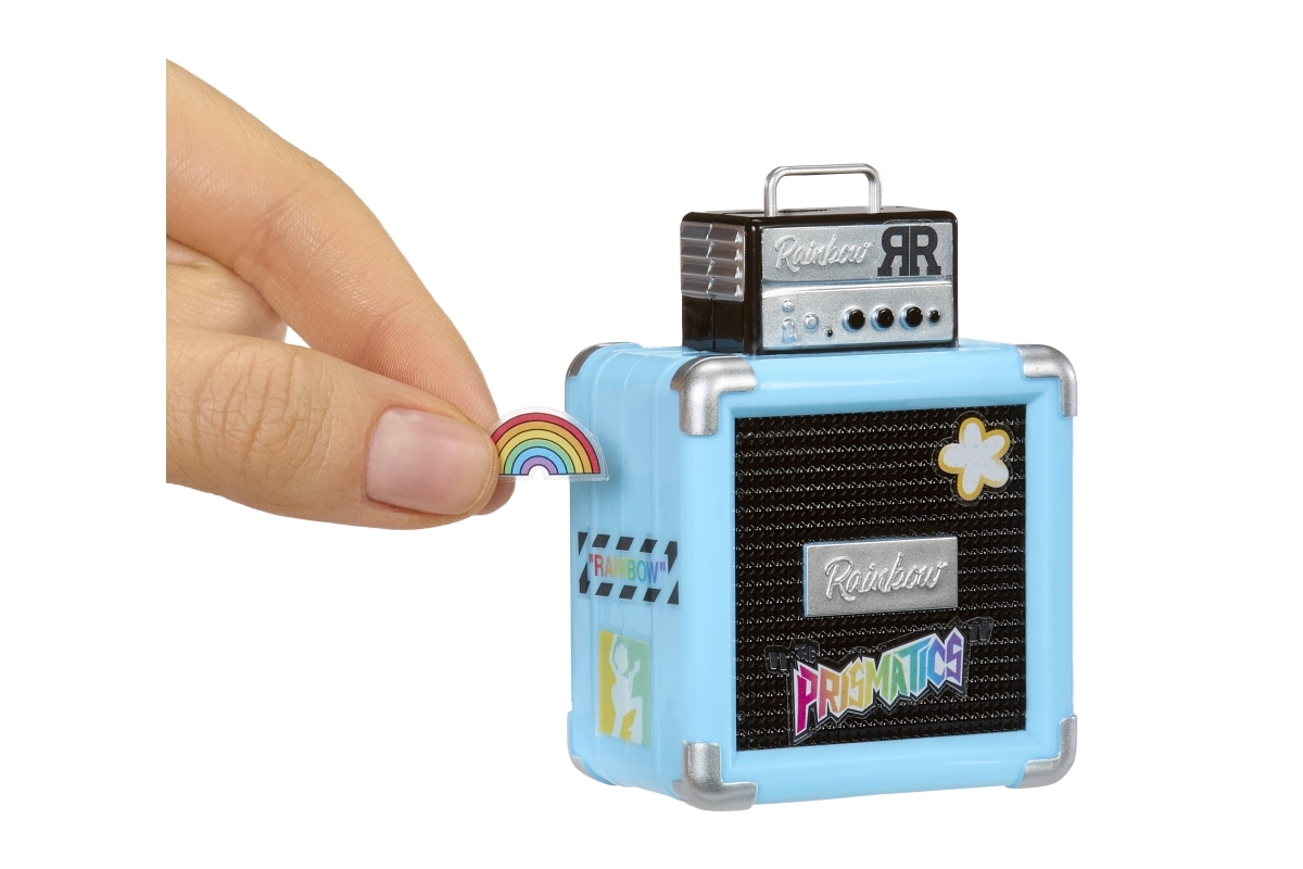 - lėlė, dviejų dalių apranga, batai, mikrofonas (su stovu), mini stiprintuvas, lipdukų lapas, šepetys