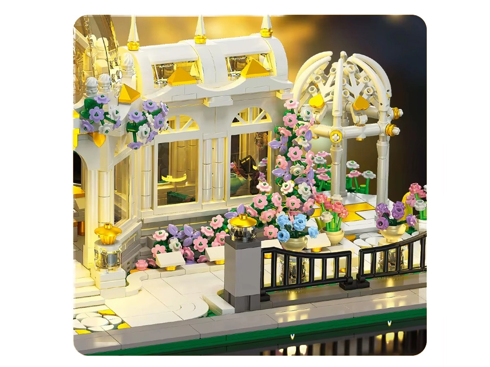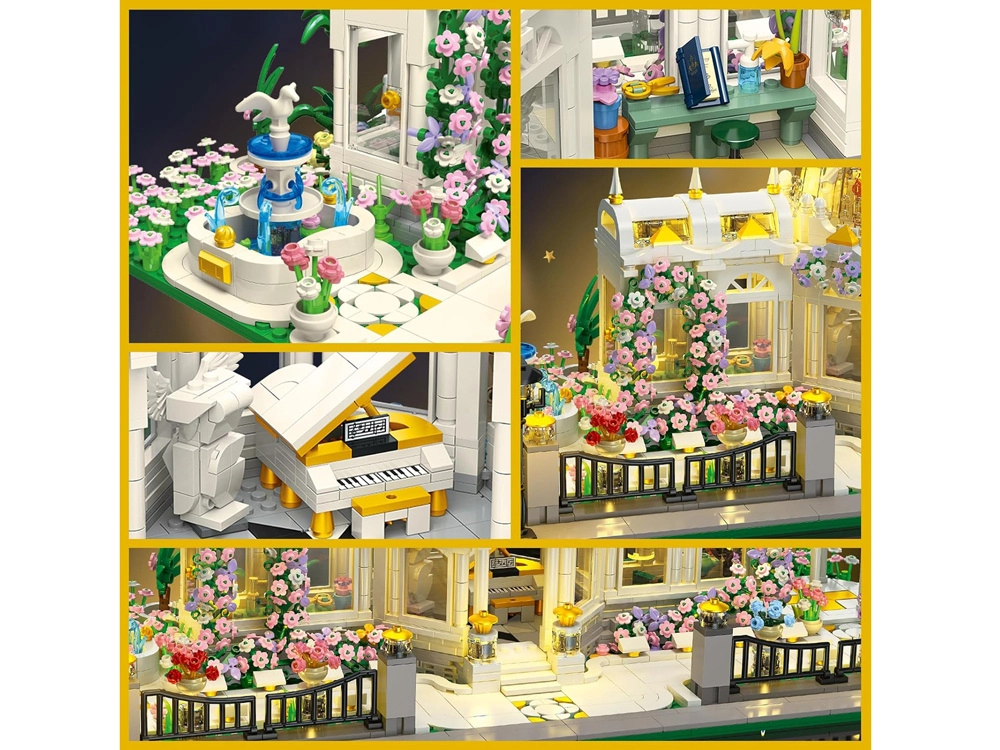 Modelis pradžiugins reiklius statytojus: rasite elegantiškus stulpus ir baliustradas su auksiniais akcentais, realius takelius, atidaromas duris ir daugybę priedų – nuo staliuko su knyga ir žirklėmis iki fortepijono bei smulkių dekoracijų. Vakaro nuotaiką sukuria LED apšvietimas, kuris nušviečia kupolą ir langus, suteikdamas žiemos sodo efektą.