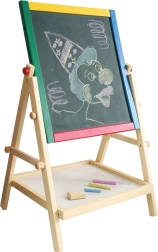 Ši medinė, dvipusė ir daugiafunkcė lentelė – puikus pagalbininkas kasdieniam žaidimui ir mokymuisi. Vaikai gali lavinti rašymą, piešimą ir pirmuosius skaičiavimus ant magnetinės baltos pusės su sausu valymu arba kurti kreidele ant tradicinės juodos kreidinės pusės. Dėl erdvios lentynėlės visos priemonės visada po ranka.