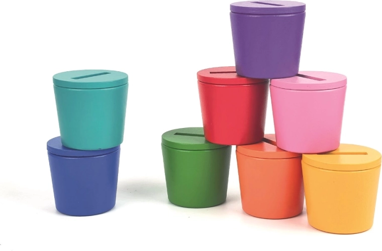 - Puodeliai su dangteliais ir angomis „monetoms“ dėti