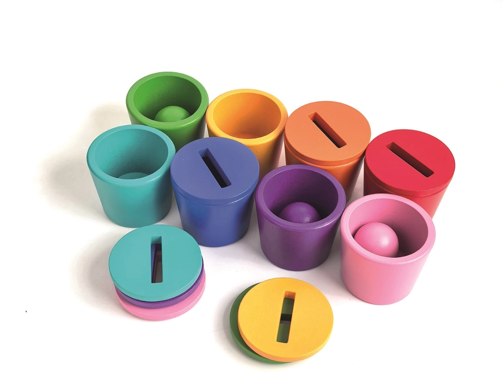 Spalvoti puodeliai su dangteliais ir plyšeliais leidžia dėti diskus, o tai lavina susikaupimą, kantrybę ir motorinį planavimą.