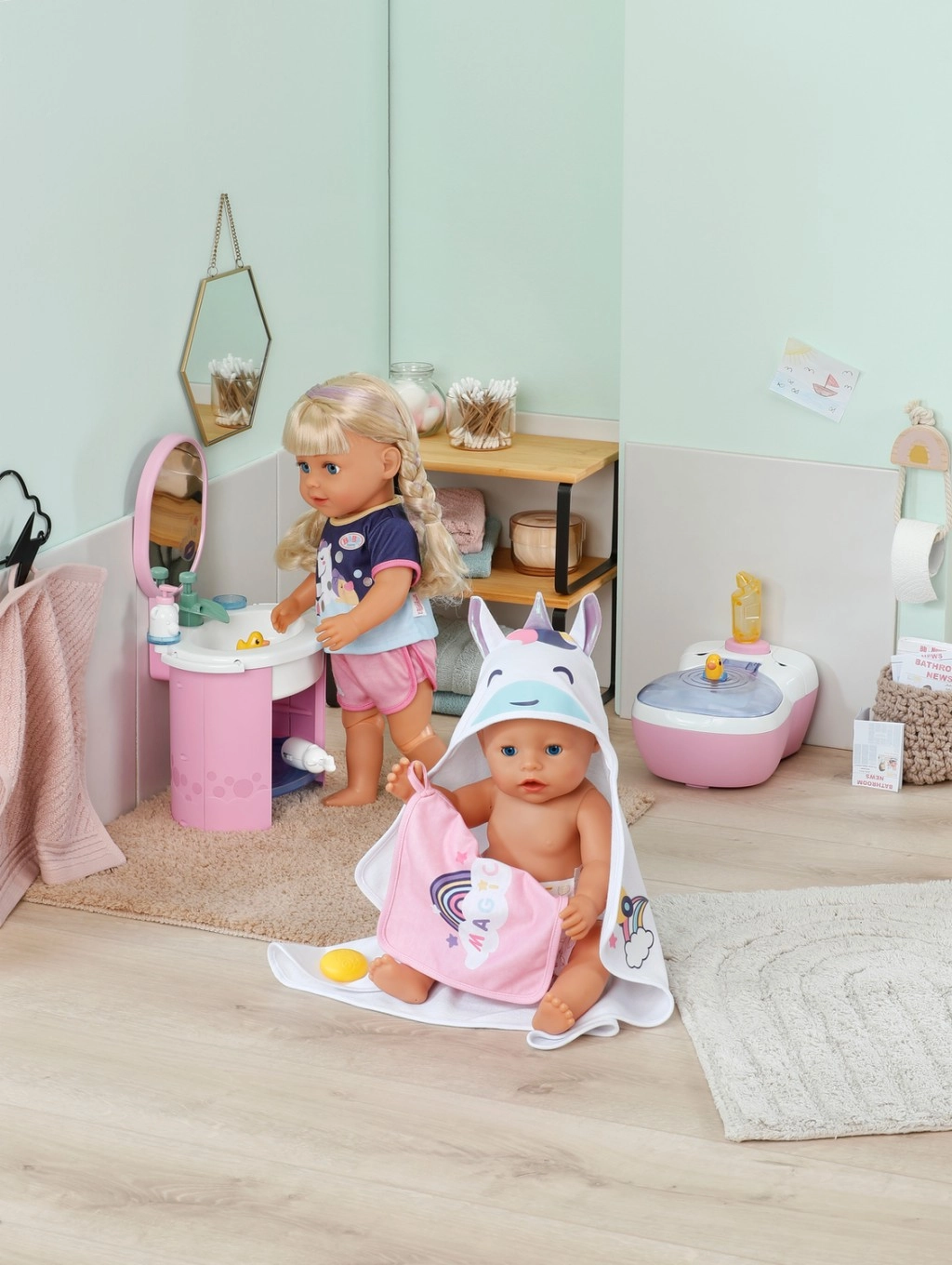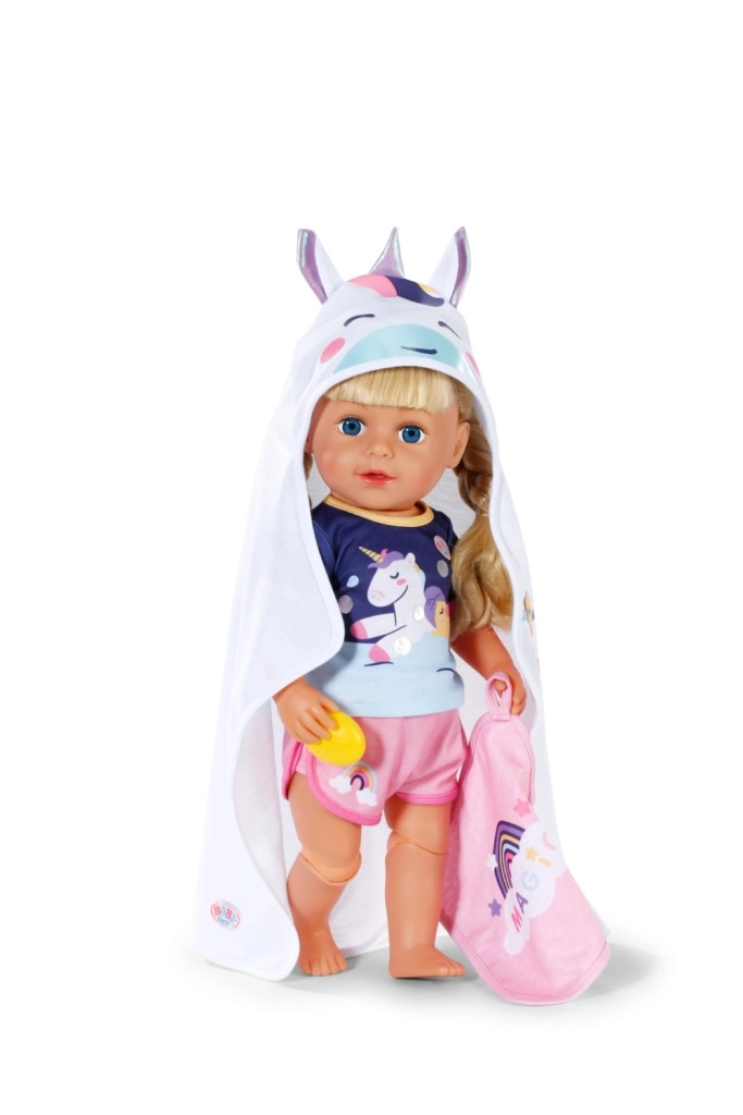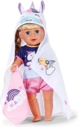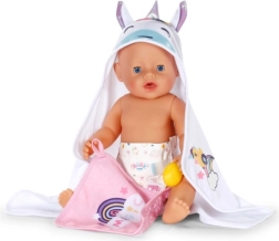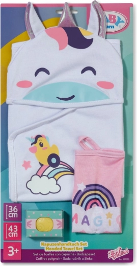 Po maudynių suteikite savo lėlytei maksimalų komfortą su šiuo žavingu BABY born rankšluosčių rinkiniu. Jame yra du minkštučiai rankšluosčiai su vienaragio ir vaivorykštės motyvu, gobtuvas su spauda ir ausytėmis. Idealu 36 cm ir 43 cm lėlėms. Minkšta medžiaga, magiškas vienaragio motyvas ir praktiškas gobtuvas stilingam džiovinimui ir žaidimams.