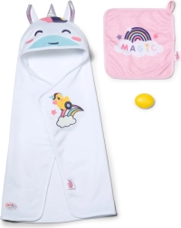 Šis magiškas BABY born rankšluosčių rinkinys suteikia viską, ko reikia linksmoms maudynių rutinoms. Du rankšluosčiai su vaivorykštės ir vienaragio motyvu pradžiugins kiekvieną mažąjį prižiūrėtoją, o gobtuvas su vaivorykštės ragu ir mielomis ausytėmis suteiks kiekvienam džiovinimui žaismingumo.
