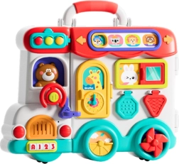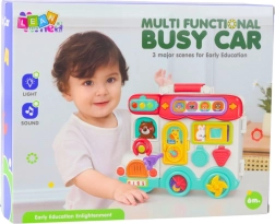Interaktyvus automobilis „Busy Car“ sujungia edukacinę panelę, formų rūšiuoklį, mažą pianinuką ir judančius elementus, kurie skatina vaikus atrasti spalvų, formų, šviesų ir garsų pasaulį. Vaikai gali spausti šviečiančius mygtukus, atidaryti dureles, sukioti ratukus, stumdyti elementus ir taip lavinti akių–rankų koordinaciją, smulkiąją motoriką bei vaizduotę.