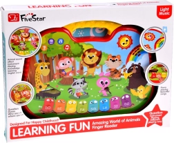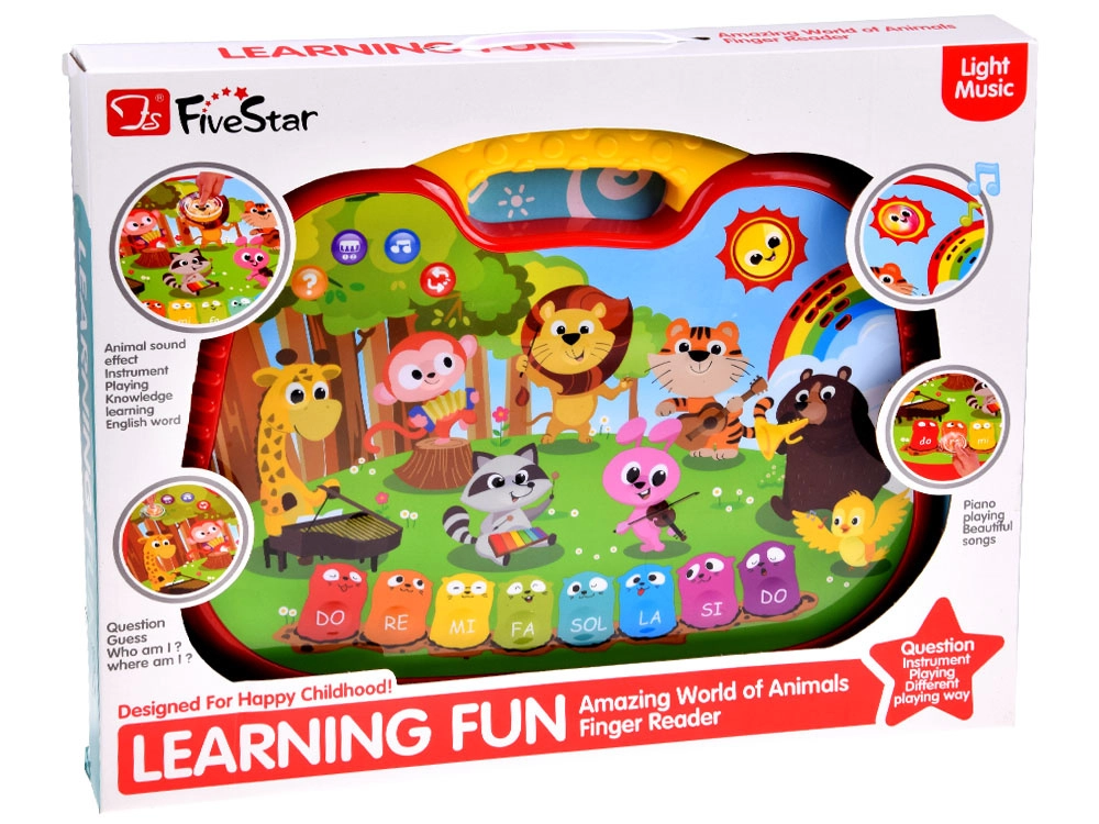 - Pavadinimų mokymasis: paspaudus paveikslėlį, žaislas pasako gyvūno/instrumento pavadinimą; paspaudus raudoną mygtuką ir vėl paveikslėlį – atkuria jų garsus.