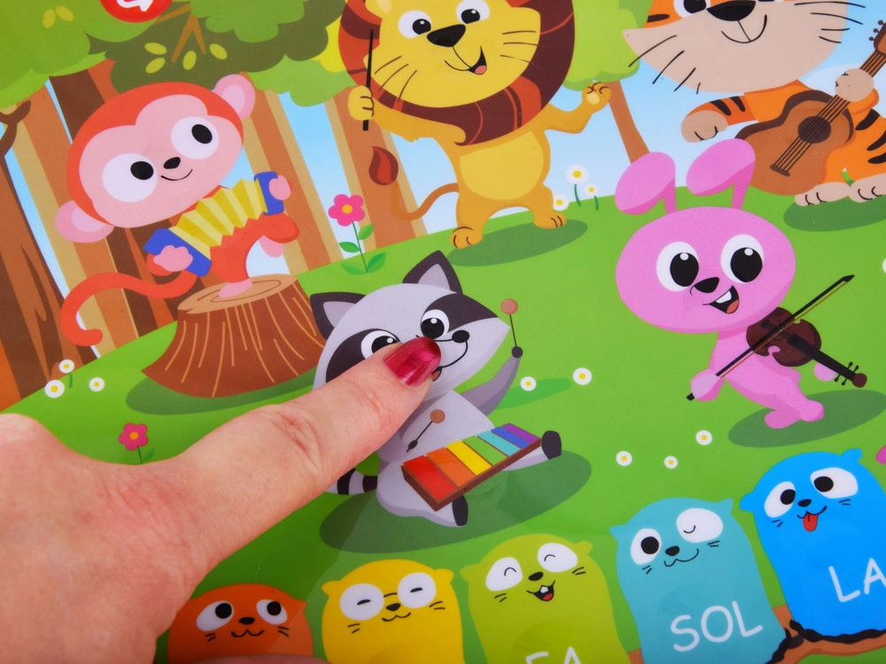 - Skatina smulkiąją motoriką, rankų–akių koordinaciją, ritmo pojūtį ir gyvūnų bei instrumentų pažinimą.