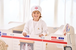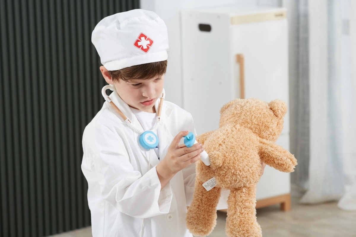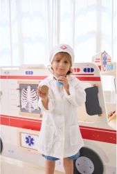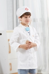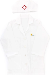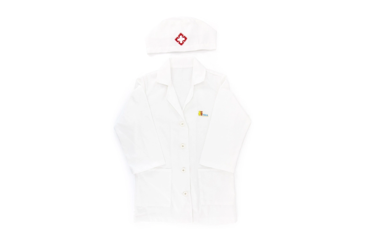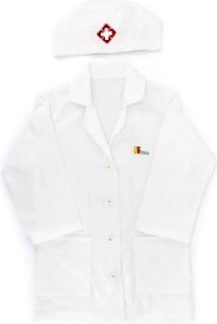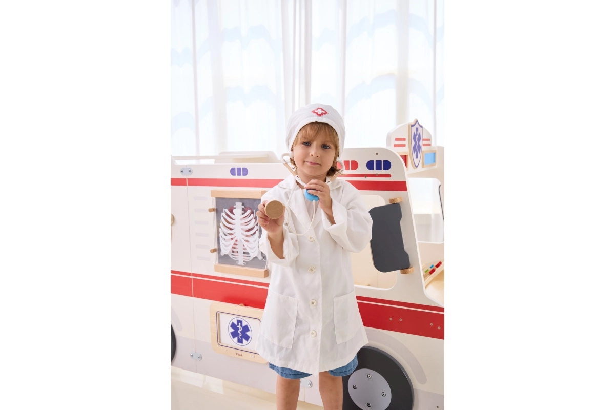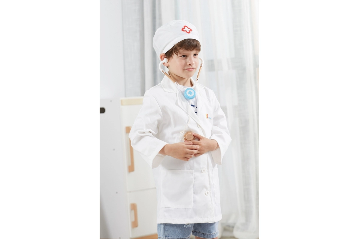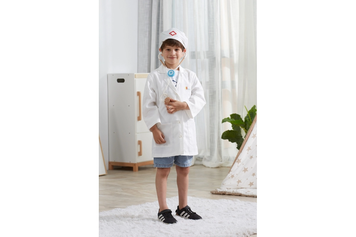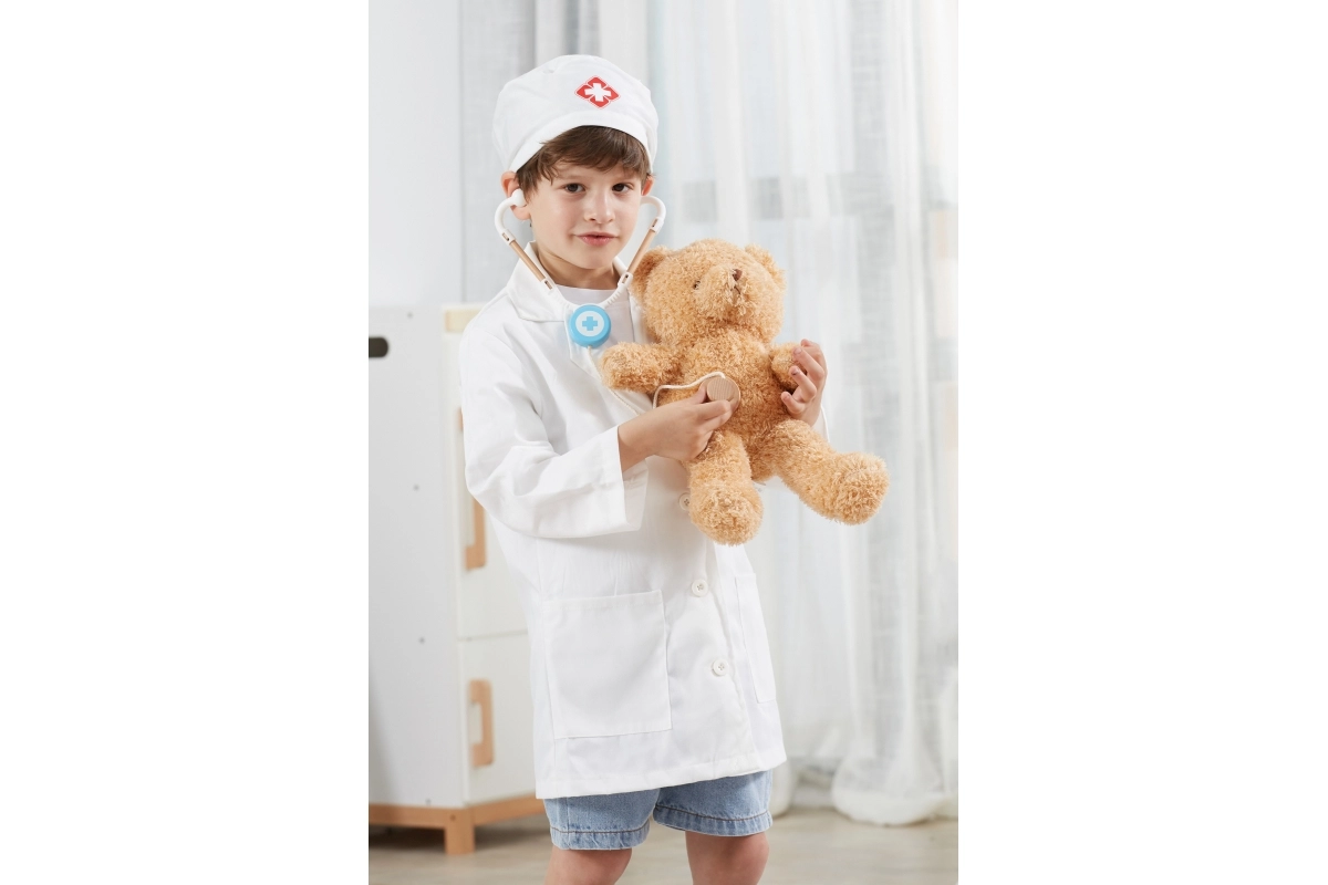 Baltas chalatas ir kepuraitė su medicinos simboliu skatina vaikų vaizduotę ir suteikia žaidimui realistišką pojūtį.