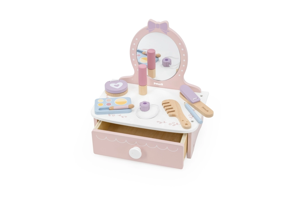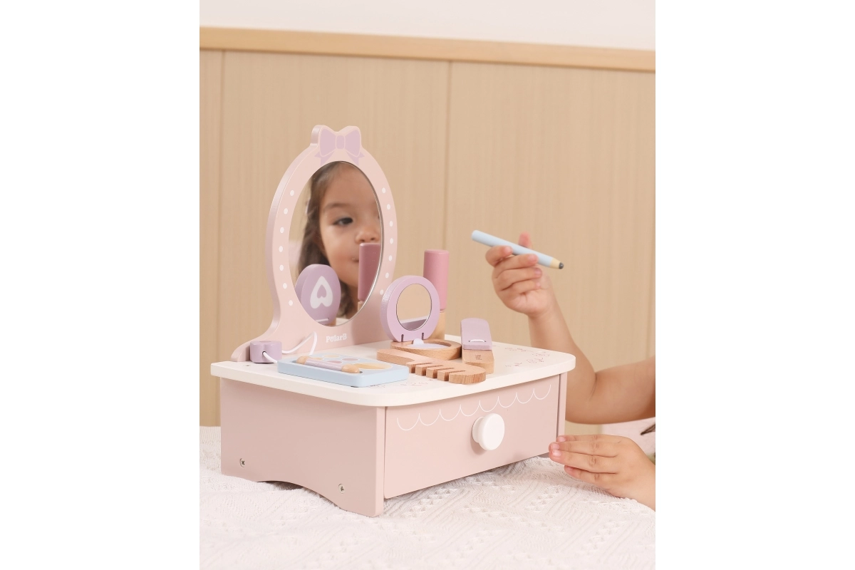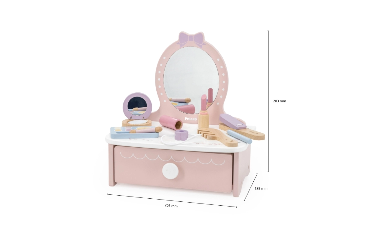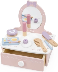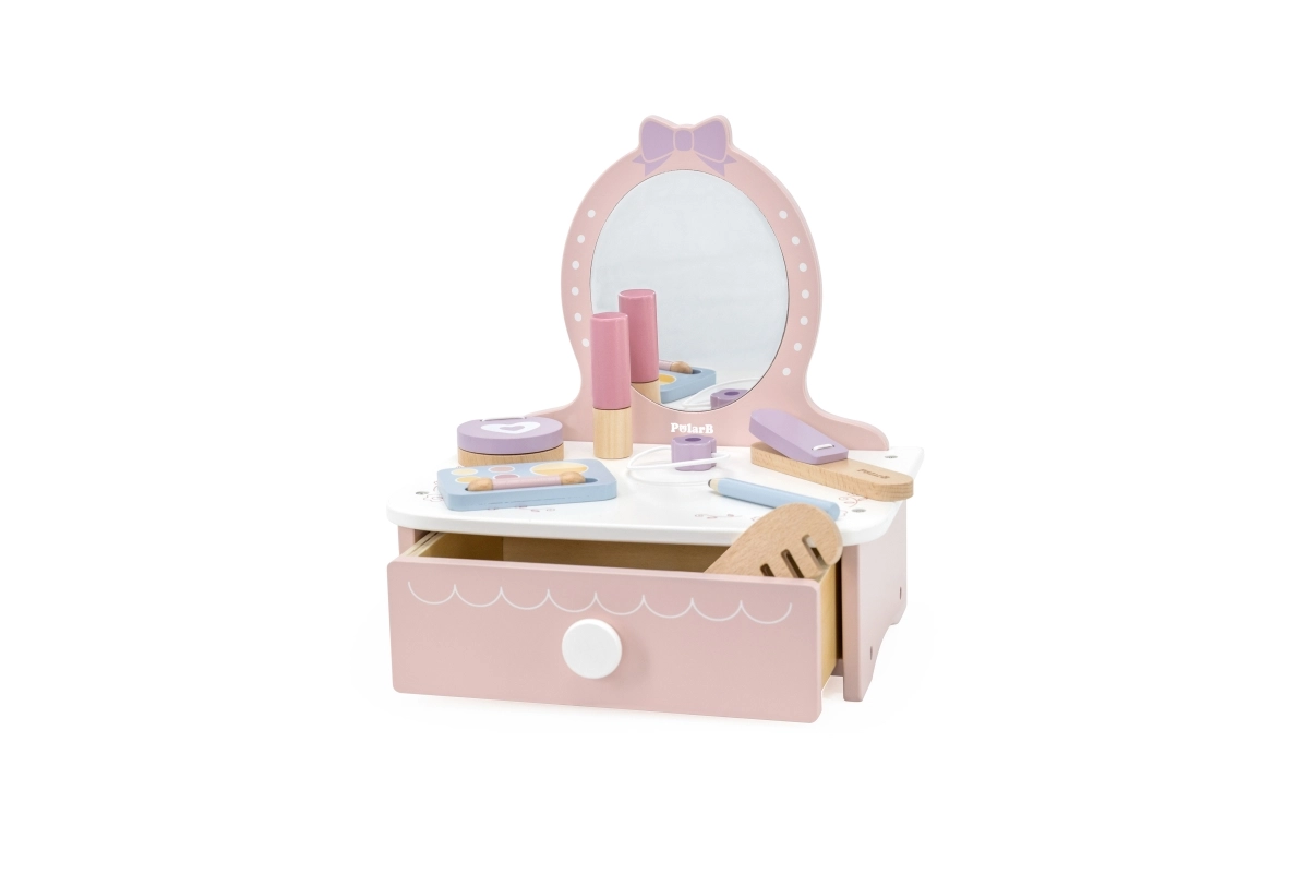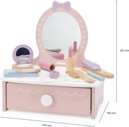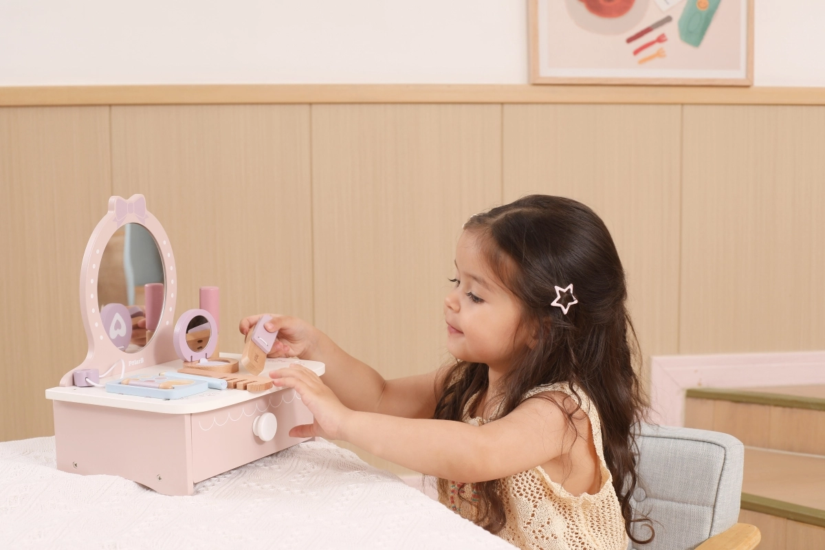 Šis mielas medinis tualetinis staliukas yra puikus kiekvieno vaikų kambario papildymas. Skatina vaizduotę, socialinį žaidimą ir smulkiąją motoriką. Dėl tvirto medinio apdirbimo jis yra saugus ir atsparus kasdieniam žaidimui.