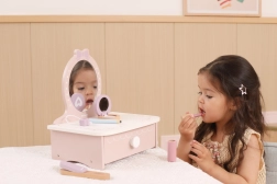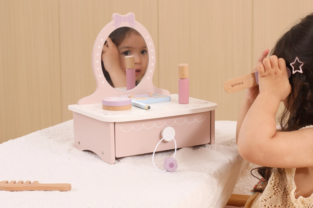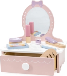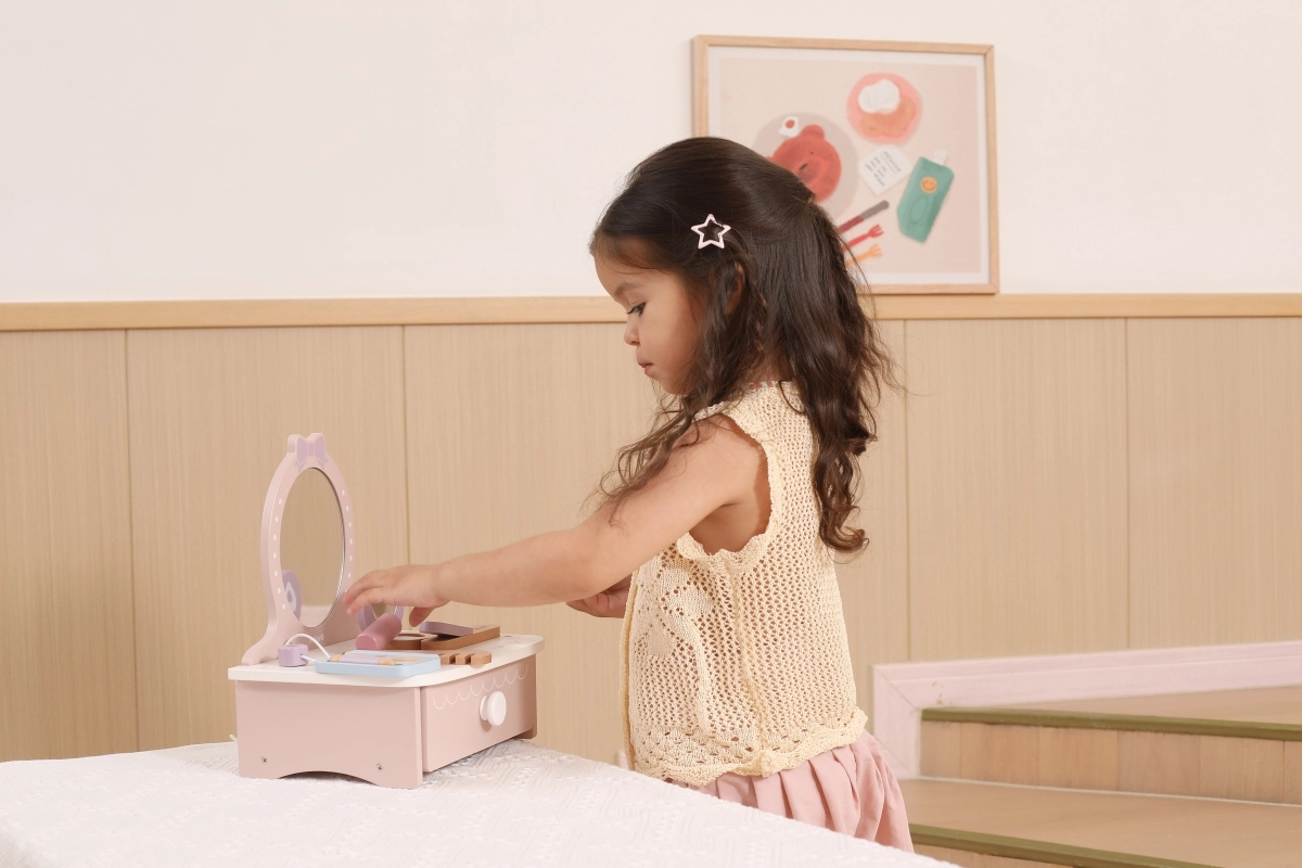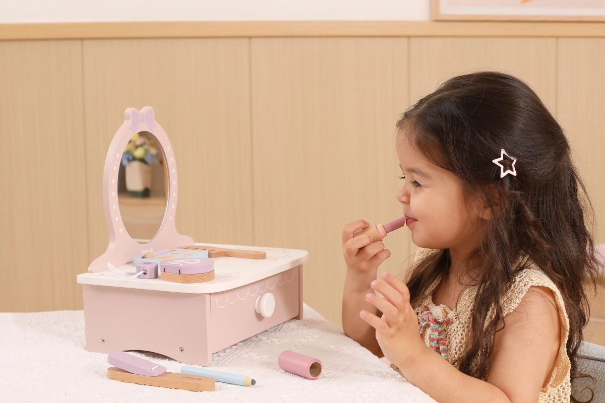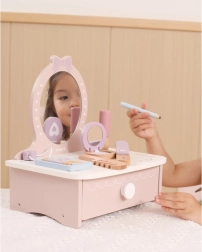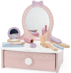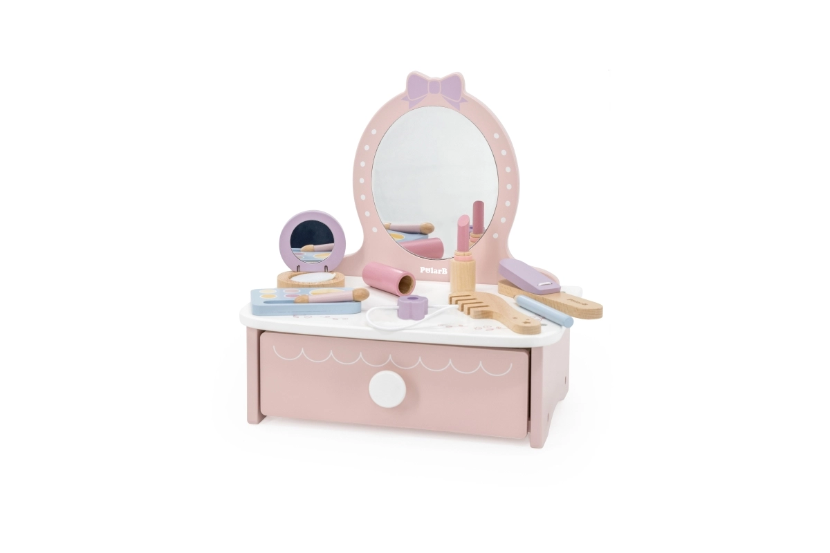 Šis mielas medinis tualetinis staliukas yra puikus kiekvieno vaikų kambario papildymas. Skatina vaizduotę, socialinį žaidimą ir smulkiąją motoriką. Dėl tvirto medinio apdirbimo jis yra saugus ir atsparus kasdieniam žaidimui.