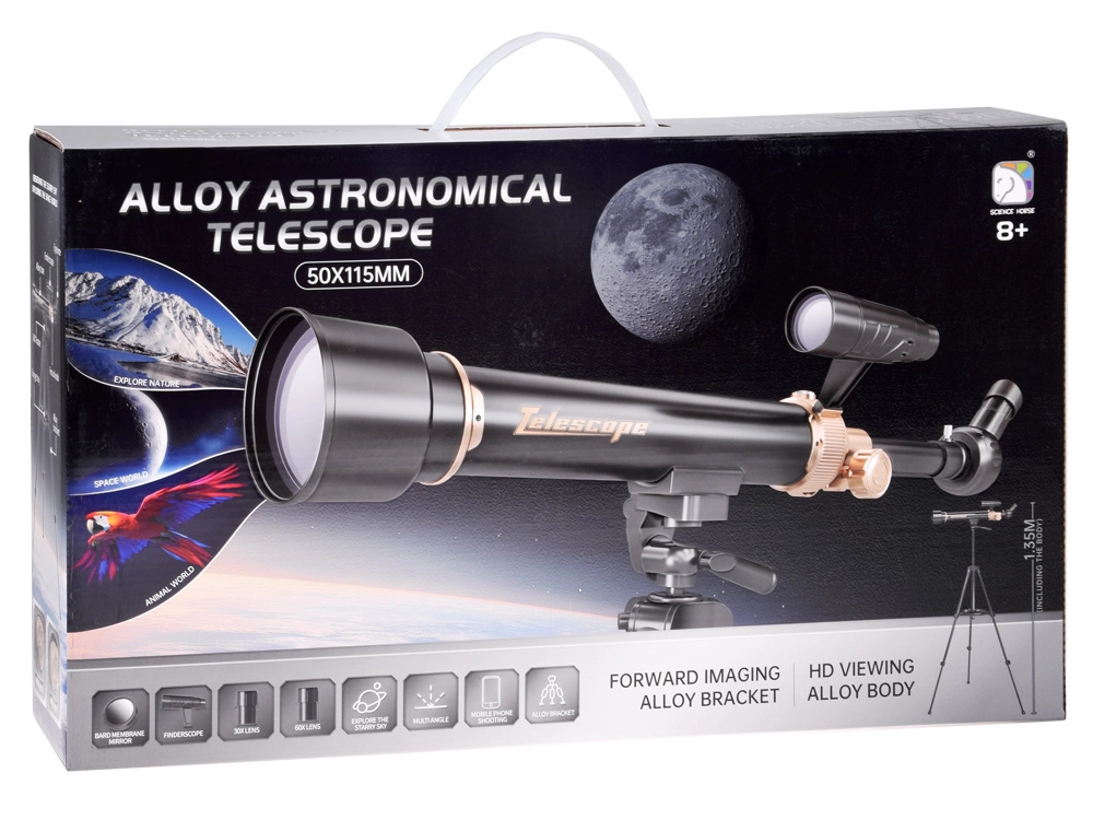 Pradėkite tyrinėti kosmosą su šiuo universaliu astronominiu teleskopu. Jis siūlo 30x ir 60x didinimą, 500 mm židinio nuotolį ir stabilų 1,3 m aliumininį stovą. Pakuotėje rasite pilną priedų rinkinį, įskaitant okuliarus, taikiklį, zenitinį veidrodėlį ir telefono laikiklį. Taip pat pridedamas specialus membraninis filtras saugiam Saulės stebėjimui.