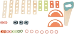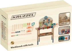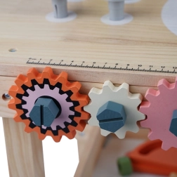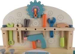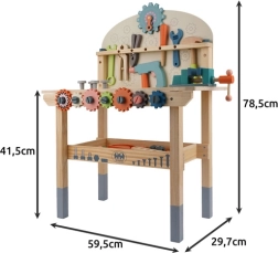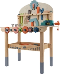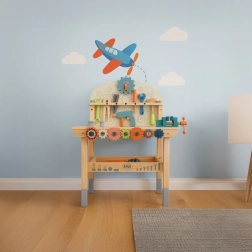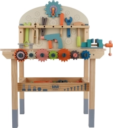 Komplekte yra gausus įrankių ir tvirtinimo elementų rinkinys, kuris lavina smulkiąją motoriką, akių–rankų koordinaciją ir loginį mąstymą. Praktiška apatinė lentyna suteikia vietos detalėms ir priedams laikyti. Puiki dovana, kuri pradžiugins kiekvieną mažą meistrą.