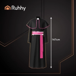 Į rinkinį įeina ilga juoda sutana su kolaretu, pelerina su apsiuvais ir liturginis diržas, kurie kartu sukuria išraiškingą ir orų įvaizdį. Dėl universalaus XL/XXL dydžio jis patogiai prisitaiko prie įvairių kūno sudėjimų ir puikiai tinka Helovinui, maskaradui, teminiams vakarėliams bei scenai.