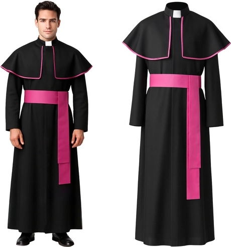 Klasikinis dvasininko kostiumas su ilga sutana, pelerina su kolaretu ir violetiniu diržu yra paruoštas persirengimas, idealus Helovinui, karnavalui, cosplay ir teatro pasirodymams. Laisvas kirpimas universalaus XL/XXL dydžio užtikrina patogumą ir lengvą apsirengimą, o realistiška išvaizda pritrauks dėmesį bet kuriame renginyje.
