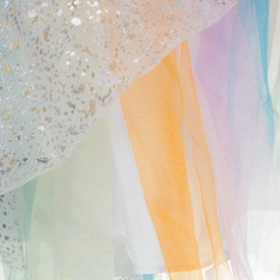 - „WOW“ efektas: blizgantis tiulis su auksinėmis žvaigždėmis ir ryškūs sparnai žavi iš pirmo žvilgsnio.