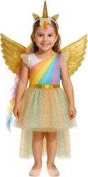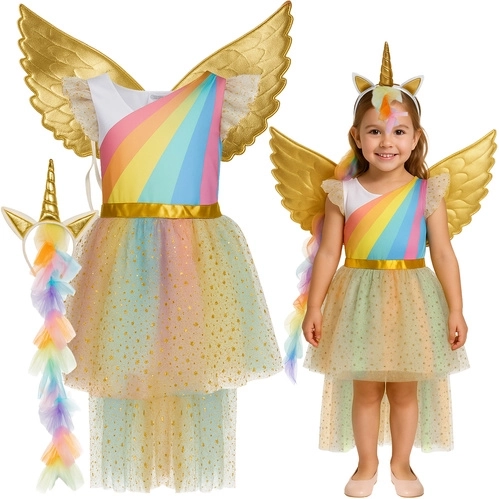Žavus vaikiškas vienaragio kostiumas, dydis 122–128 cm, pavers kiekvieną mažą princesę magiška būtybe. Rinkinyje yra sijonėlis su blizgančiu tiulio sluoksniu, auksiniai sparnai ir lankelis su ragu. Kostiumą lengva ir patogu apsivilkti per galvą, jis idealiai tinka karnavalui, Helovinui, šventėms ir mokykliniams pasirodymams, o taip pat jį galima skalbti skalbimo mašinoje 30 °C. Sertifikavimas pagal Europos standartus užtikrina saugų naudojimą.