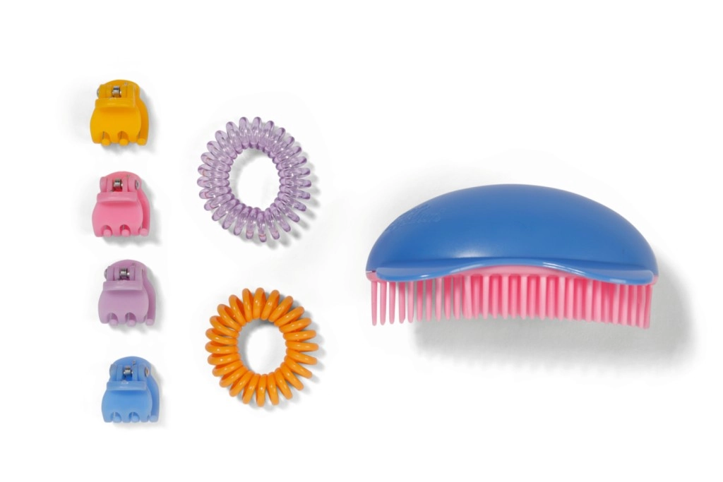 - 7 plaukų aksesuarai – šepetys, 2 gumytės, 4 segtukai.