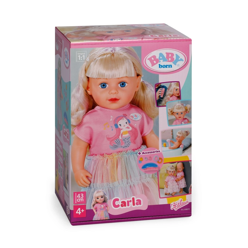 Lėlė BABY born Carla suteikia vaikams daugybę galimybių kūrybiškam žaidimui. Ilgi ir švelnūs nailoniniai plaukai idealiai tinka šukuoti, rišti uodegas ir pinti kaseles. Rinkinį sudarantys 7 aksesuarai – šepetys, gumytės ir segtukai – kasdieniam plaukų formavimui įkvėps fantaziją.