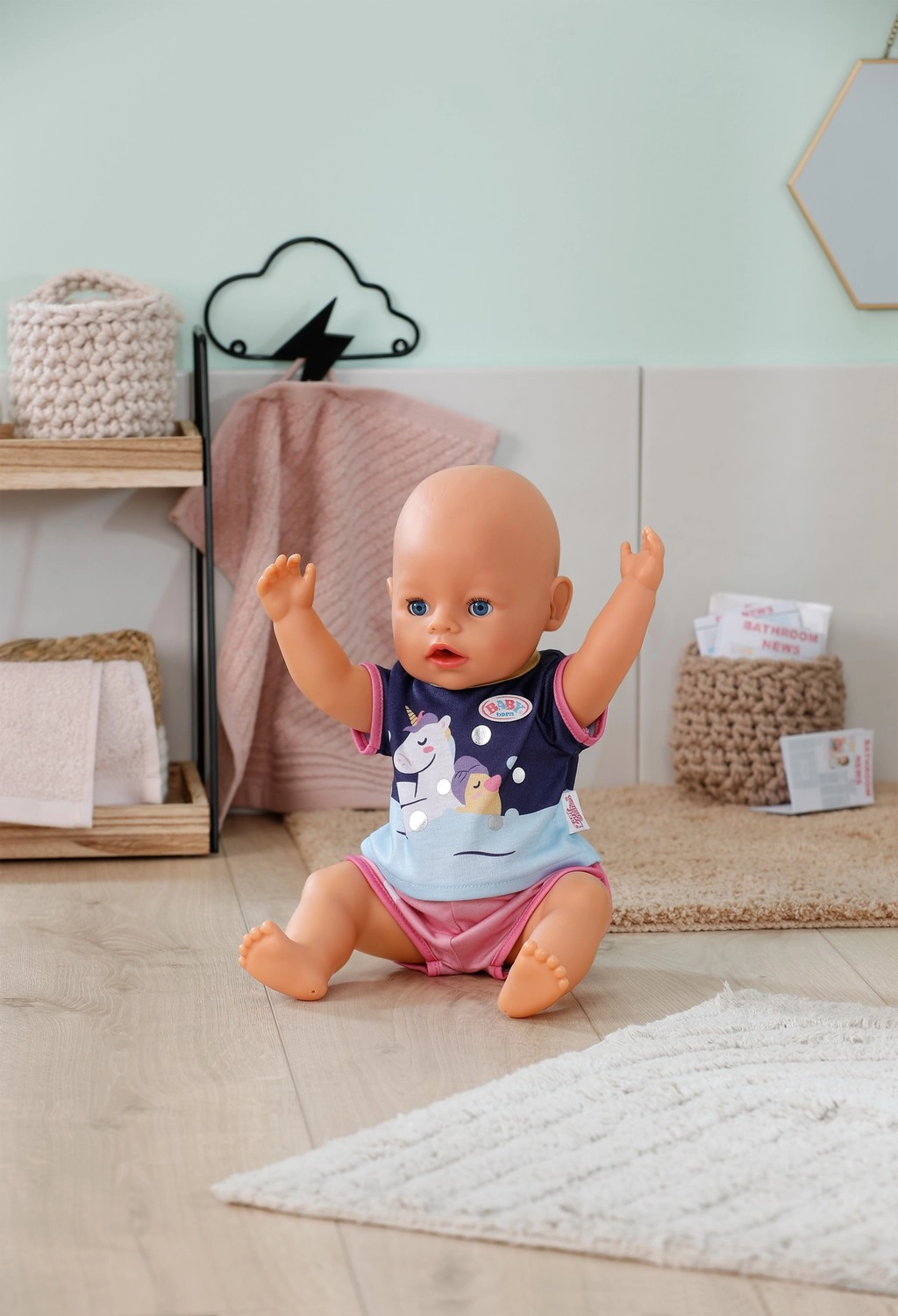 Linksmas vienaragio, ančiuko ir vaivorykštės aplikacijų raštas suteikia drabužėliui žaismingą išvaizdą, kuri skatina vaikus rūpintis savo lėle – nuo vakarinės higienos iki paguldymo į lovelę. Kokybiškas pasiuvimas užtikrina malonų prisilietimą ir ilgaamžiškumą net dažnai persirengiant.