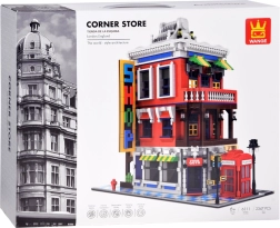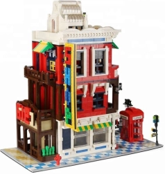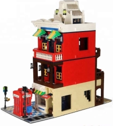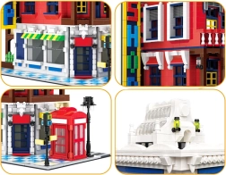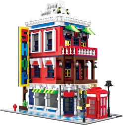 Modelis kupinas ikoniškų priedų: raudona telefono būdelė – Didžiosios Britanijos simbolis, gatvės ženklas scenos realistiškumui, puošnus iškabas skydas ir išdirbtas stogas, pabrėžiantis pastato architektūrinį stilių.
