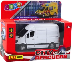 - metalinė 1:32 furgono miniatiūra su pull back pavara, 3× AG13 baterijos, originali pakuotė