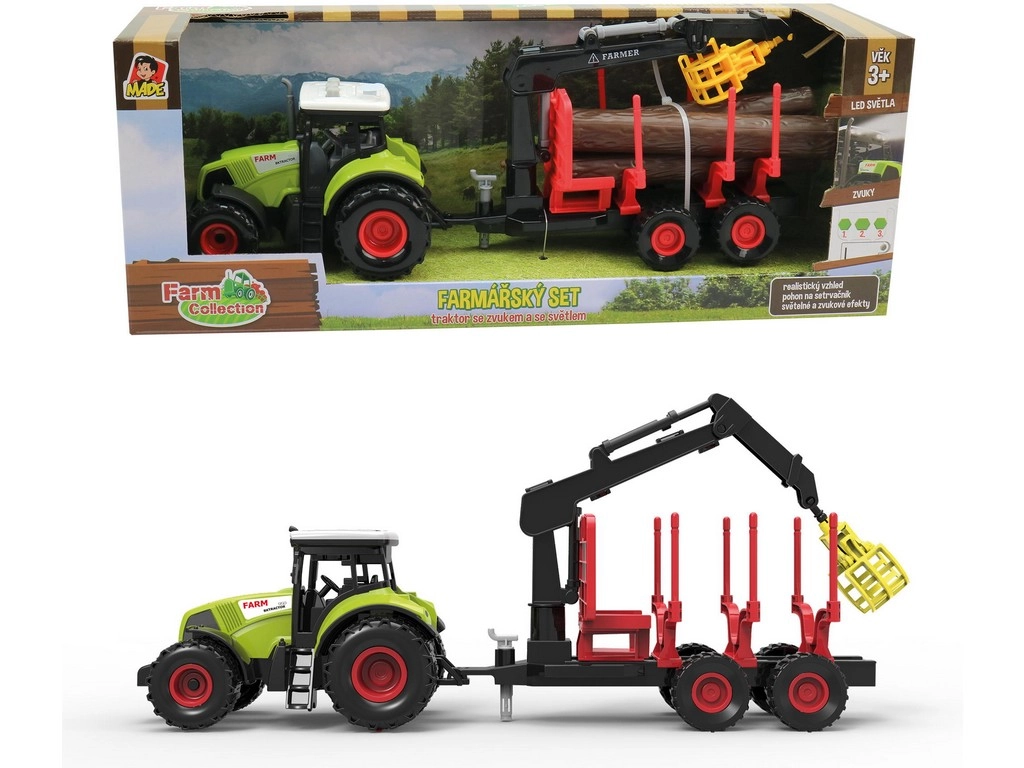 Šis žalias MaDe traktorius su priekaba ir strėle yra puikus žaislas visiems mažiesiems žemės ūkio technikos mėgėjams. Paspaudus mygtuką įsijungia realistiški garsai ir šviesos efektai, kurie skatina vaizduotę ir pramogą žaidžiant. Čekiška dėžutė pradžiugins kaip dovana.