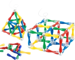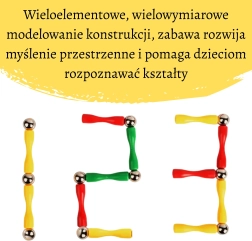 - 38 magnetinės lazdelės (mėlyna, geltona, oranžinė), 40 metalinių rutuliukų, 50 skaidrių jungčių stabilizatorių