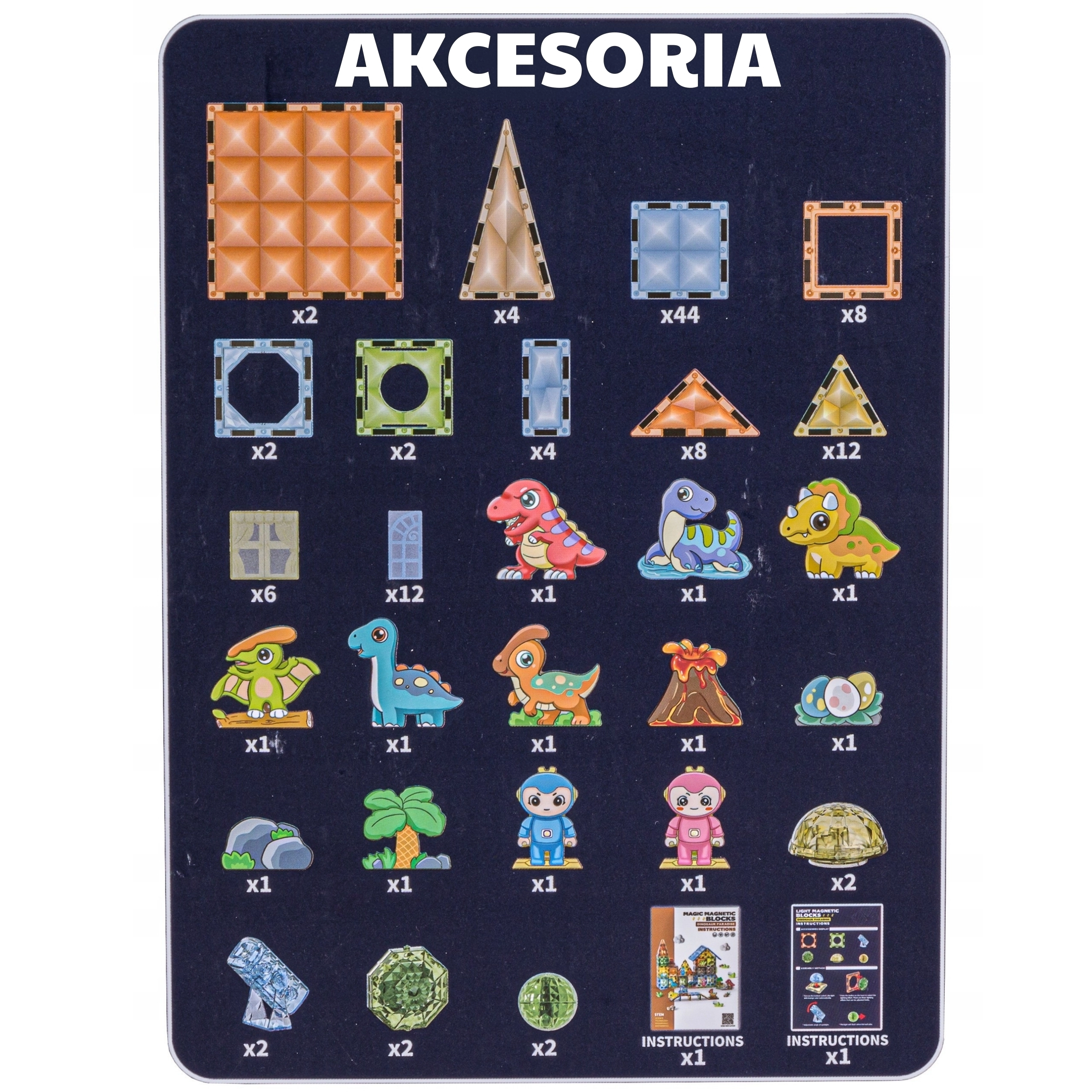 Kurkite kartu unikalų priešistorinį pasaulį. Magnetinės detalės lengvai jungiasi, tvirtai laikosi ir įspūdingai švyti tamsoje, kas suteikia statyboms naują matmenį. Vaikai gali statyti aptvarus, ugnikalnius ir dinozaurų prieglobsčius, o žaisdami natūraliai lavina erdvinę vaizduotę ir loginį mąstymą.