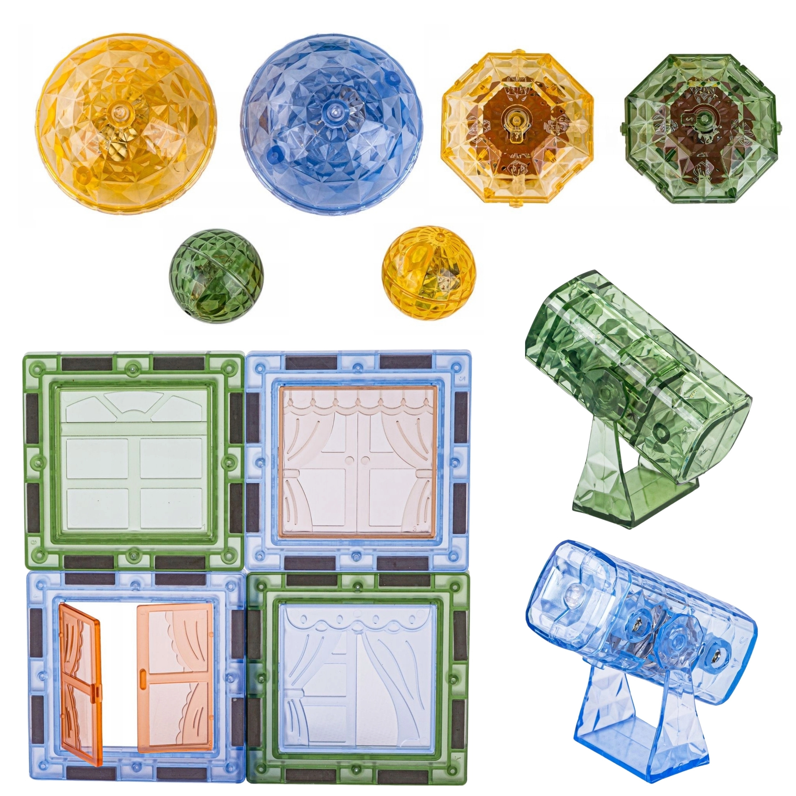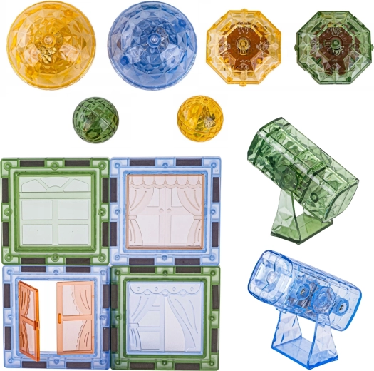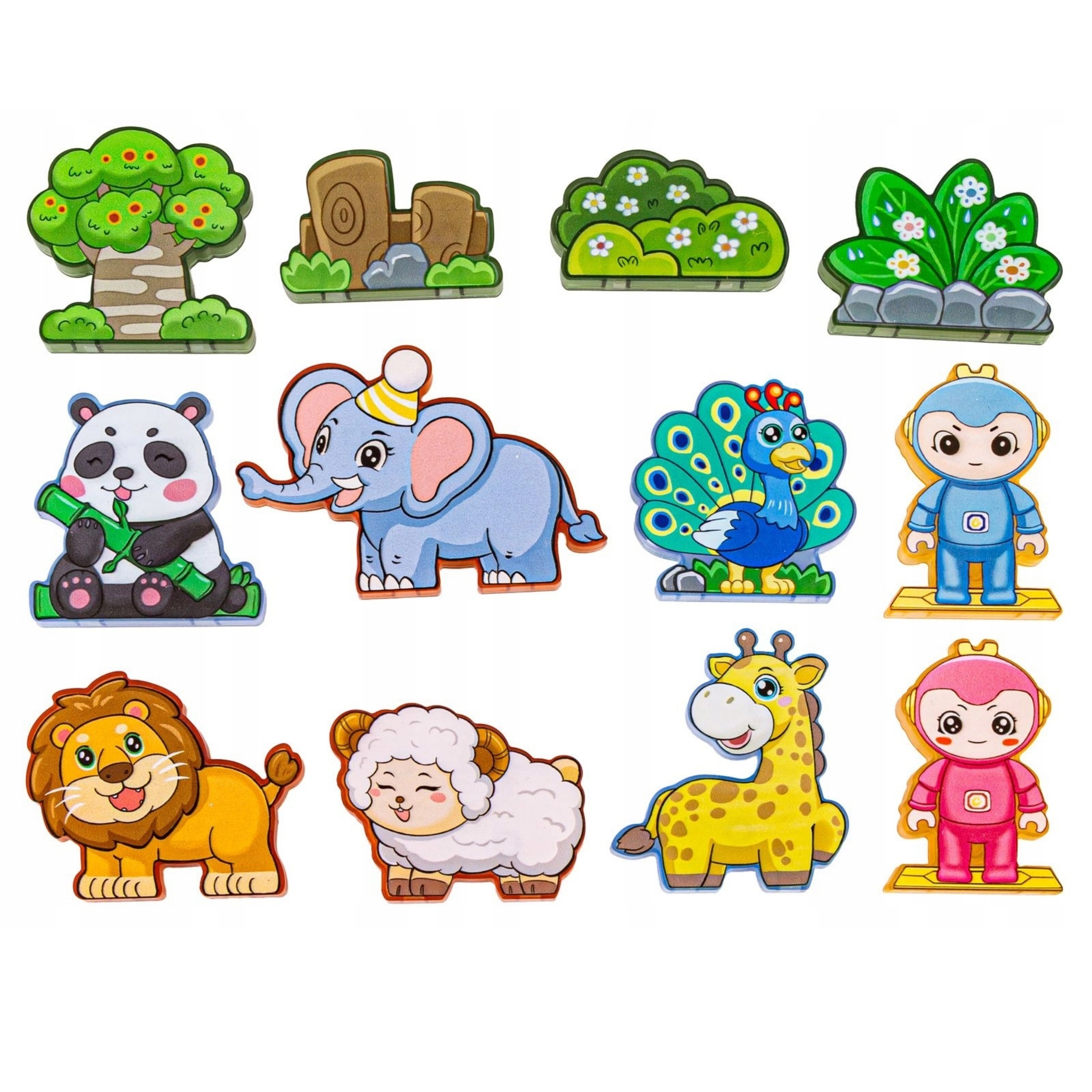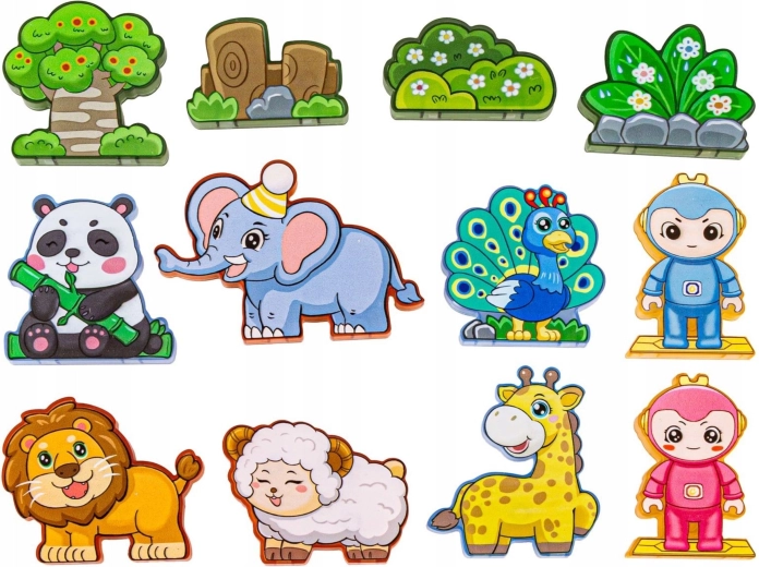 - Įvairios dalys: magnetinės formos, gyvūnų figūrėlės ir personažai, teminiai priedai (medis, uolos).