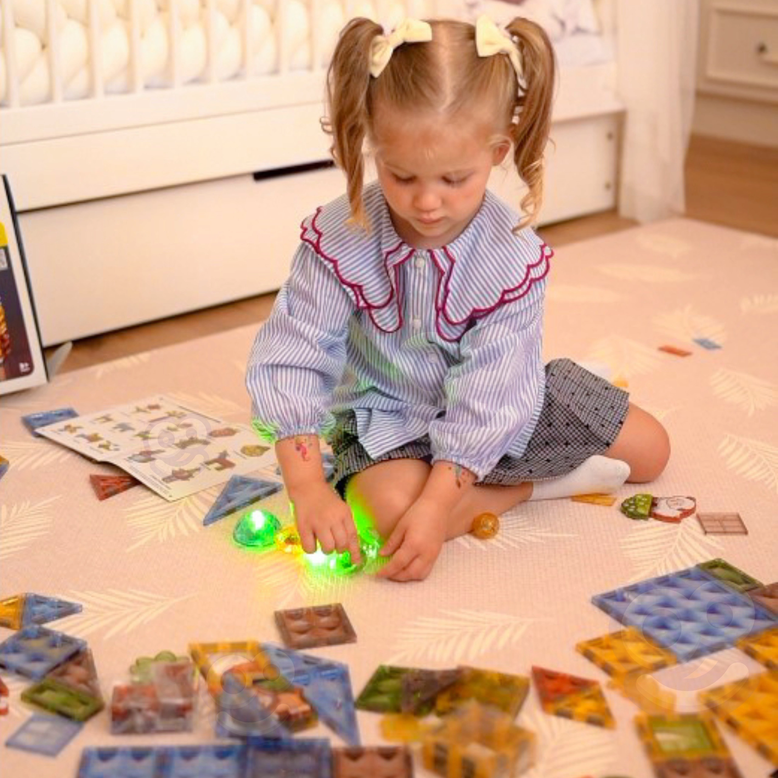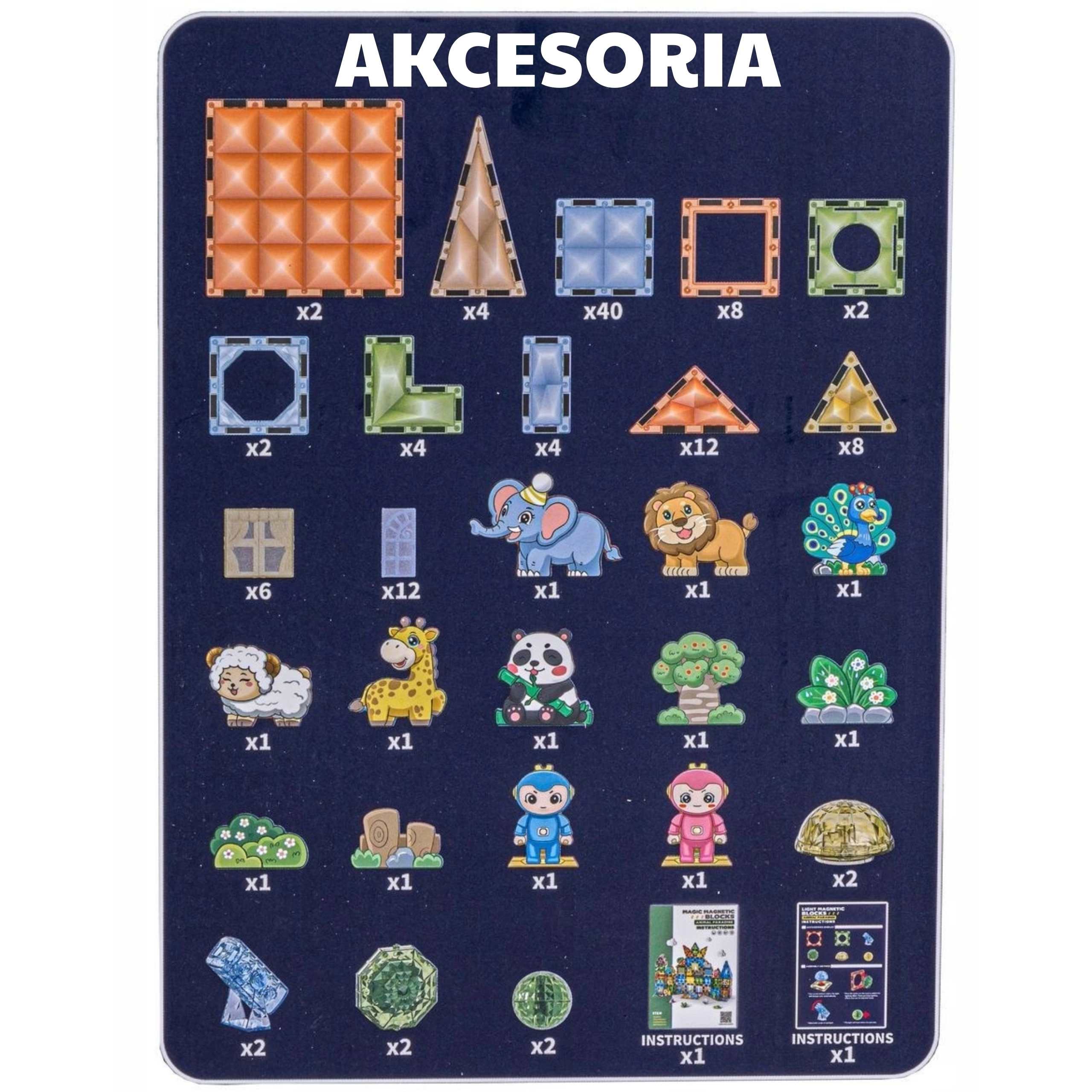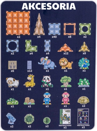 - Įvairių formų magnetinės dalys, gyvūnų figūrėlės, personažų figūrėlės, teminiai priedai (medis, uolos), instrukcija