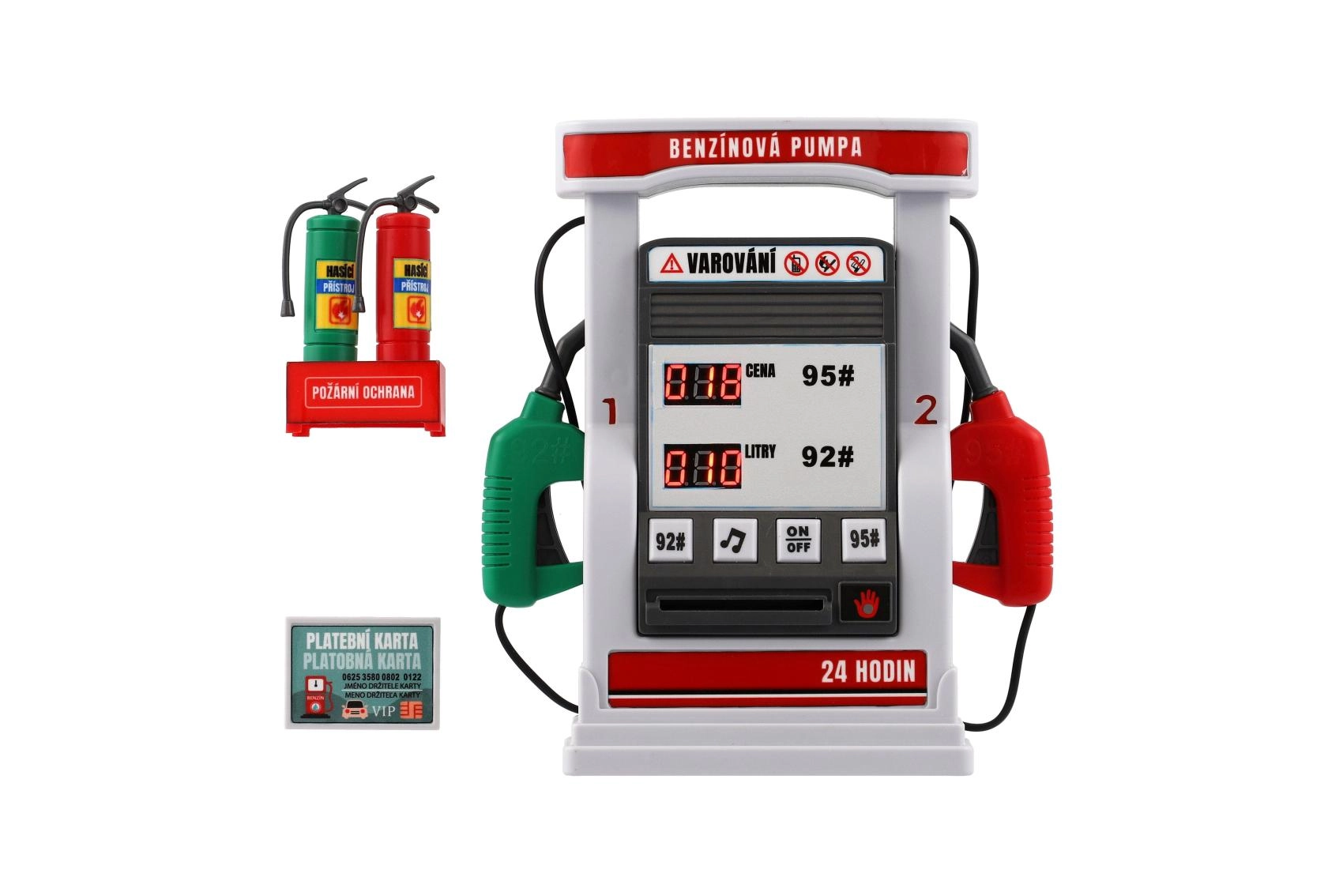 Rinkinyje yra dvi pylimo žarnos, mokėjimo kortelė, gesinimo įranga ir kiti priedai, kurie sukuria realistišką degalinės aplinką. Kompaktiška pakuotė idealiai tinka žaisti namuose ir kelionėse.