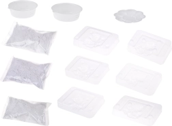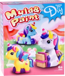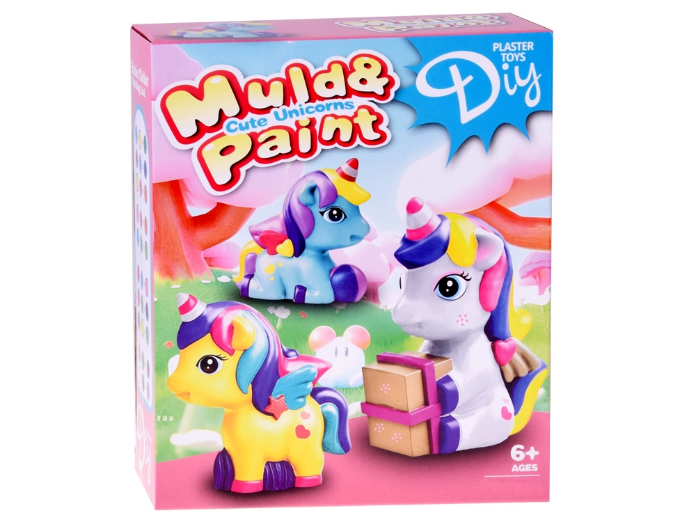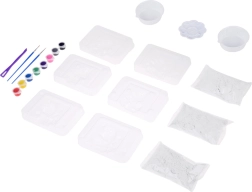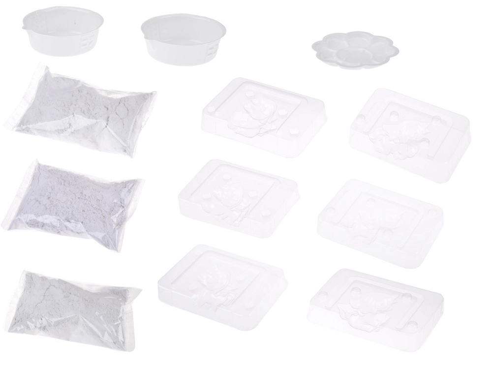 Rinkinio turinys: 3 maišeliai gipso, 3 vienaragių formos, 2 matuokliai, 1 paletė/indelis dažams maišyti, 8 spalvos, 2 teptukai, 1 plastikinis peiliukas. Patarimas: norint lygaus liejinio paviršiaus, maišykite gipsą iki visiško ištirpimo ir švelniai stukstelėkite formą, kad pasišalintų oro burbuliukai.