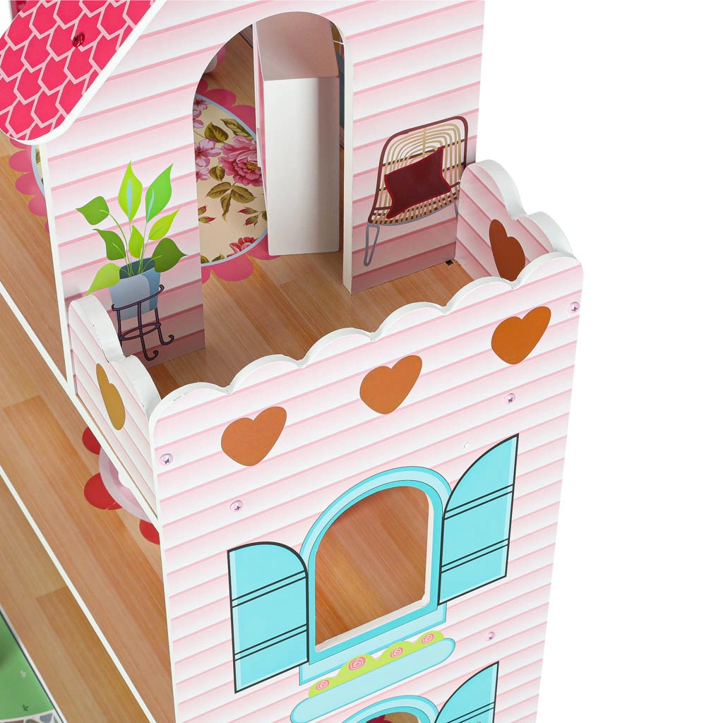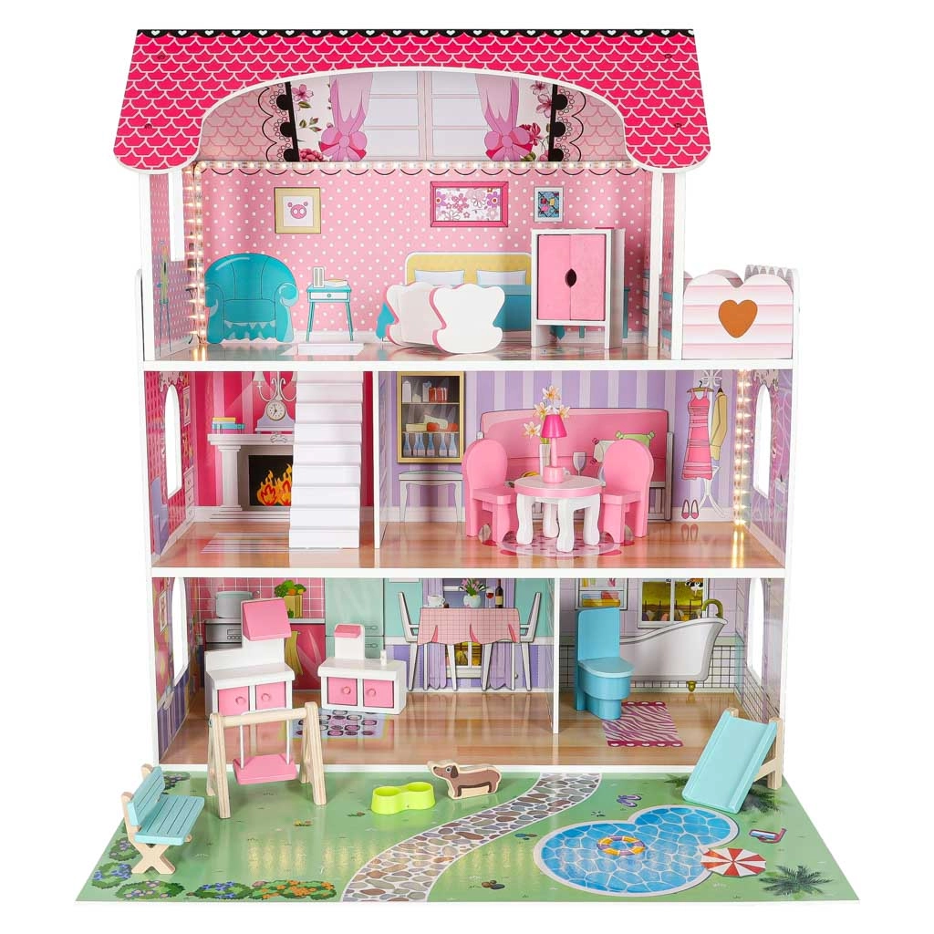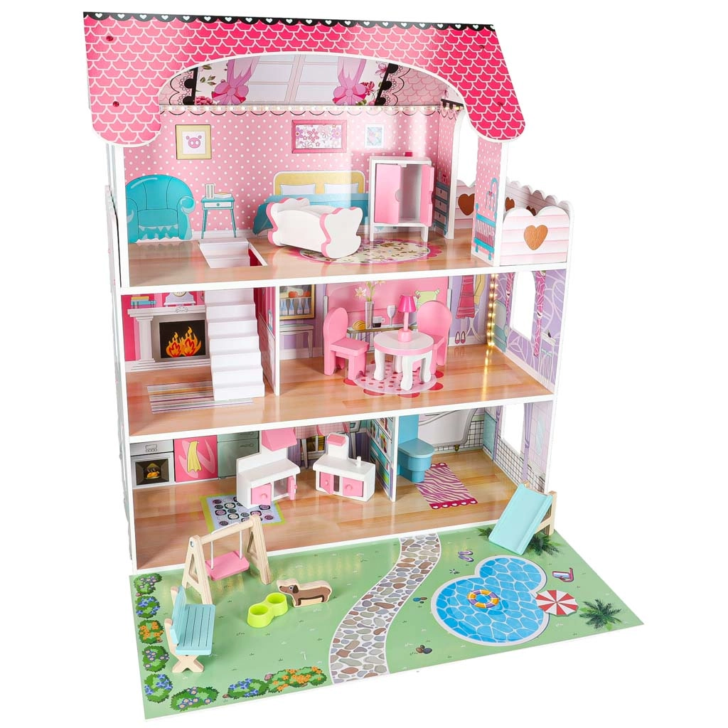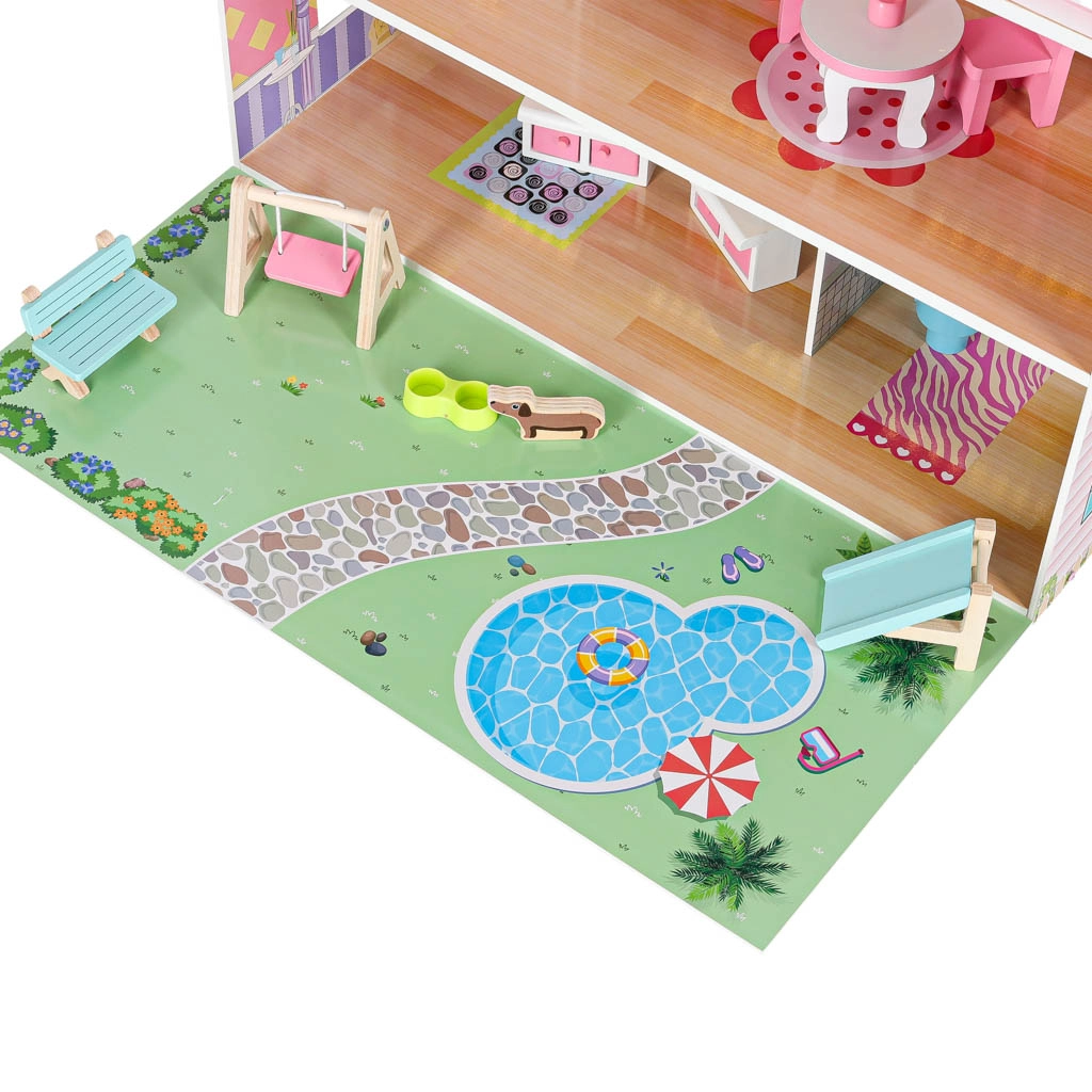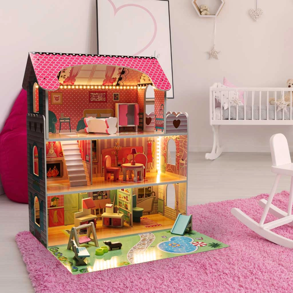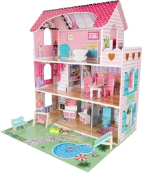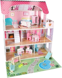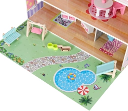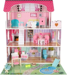 Trys aukštai, balkonas, laiptai ir sodas su žaidimų aikštele. Vaikai gali laisvai perstatinėti baldus ir kurti begalinius žaidimo scenarijus.