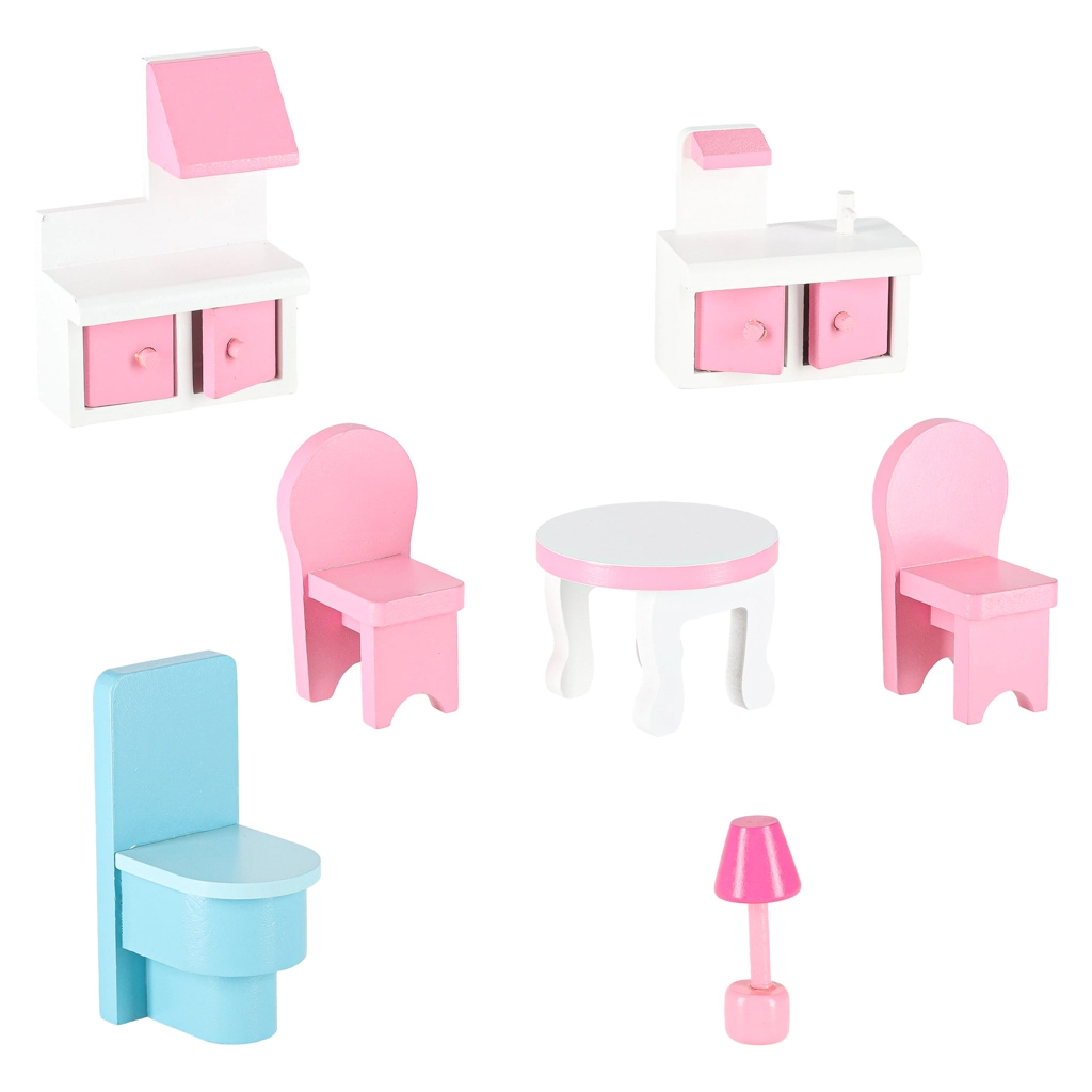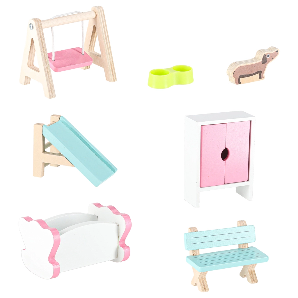 Stalas, kėdės, lovytė, spinta, virtuvėlė, vonios įranga, sūpynės, suoliukas ir šuniuko figūrėlė – viskas paruošta nedelsiam žaidimui.