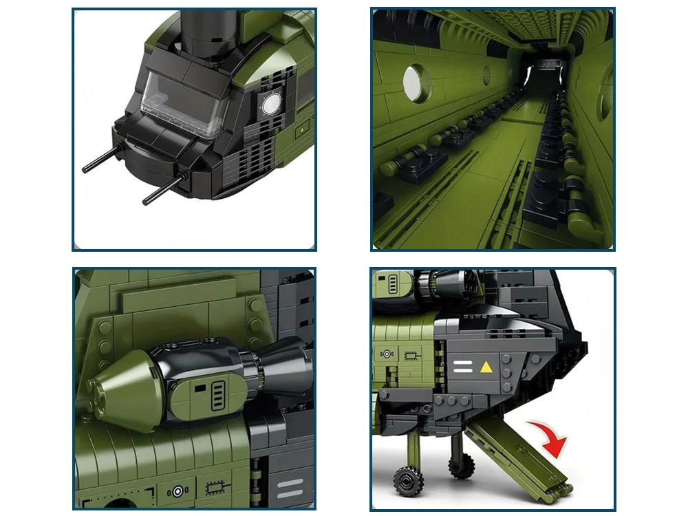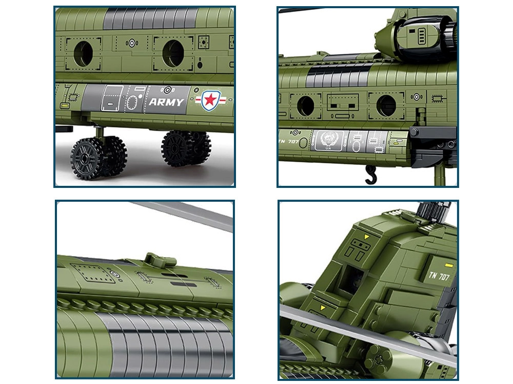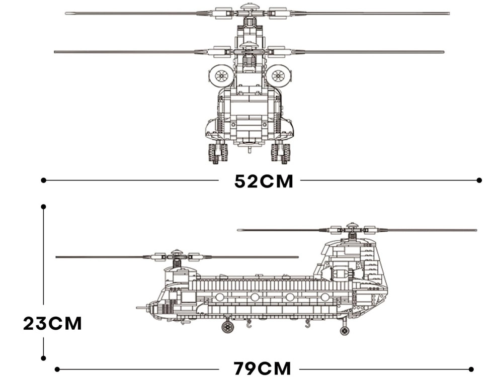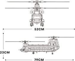 Sukonstruokite legendinį CH-47 CHINOOK iš 1451 detalės ir mėgaukitės realistiškomis ypatybėmis, tokiomis kaip dvejopi rotoriniai sraigtai, atidaroma rampa ir durys bei detaliai ištobulintas fiuzeliažas. Didelis modelis (apie 79 × 52 × 23 cm) suteiks puikią statymo patirtį, yra suderinamas su populiariais kaladėlių prekių ženklais ir puikiai atrodys bet kurioje kolekcijoje.