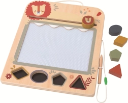 Ši kokybiška medinė magnetinė piešimo lenta su mielu liūtuku sužavės mažuosius menininkus. Prie virvelės pritvirtintas magnetinis rašiklis nepasimes, o vaikai galės saugiai piešti paveikslėlius, formas ir pirmąsias raides. Trinimo slankiklis su liūtuko motyvu užtikrina greitą viso piešinio ištrynimą vienu judesiu.