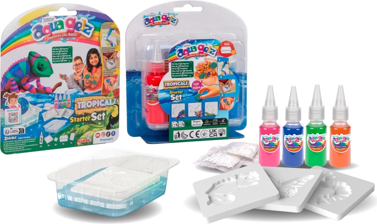 Atraskite žaismingą kūrybą su AQUA GELZ – smagia rinkine, su kuria vaikai lengvai kuria spalvotas gelio figūrėles. Sumaišykite specialius miltelius su vandeniu, pasirinkite formelę, užpildykite ją spalvotais geliais ir trumpai panardinkite. Per akimirką plokščias vaizdas virsta minkštučiu 3D figūrėle, kuri pati išsiima iš formelės.