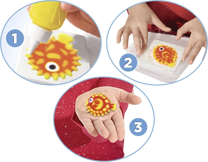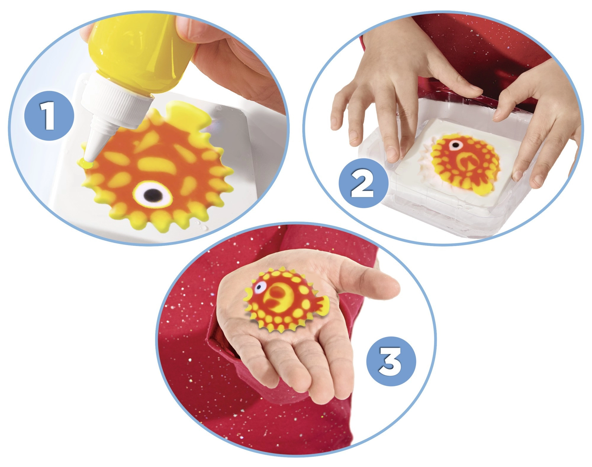 Sumaišykite tirpalą, užpildykite formą geliu ir panardinkite į vandenį – akimirksniu susidarys minkšta 3D figūrėlė, paruošta žaidimui.