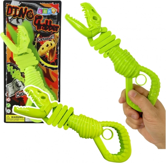 Smagus ir interaktyvus žaislas vaikams – žalias griebtuvas dinozauro skeleto formos. Paspaudus rankeną, žandikauliai užsiveria ir saugiai suima daiktą, taip lavinant smulkiąją motoriką, judesių koordinaciją ir kūrybišką žaidimą. Pagaminta iš patvaraus plastiko ilgalaikiam ir saugiam naudojimui.